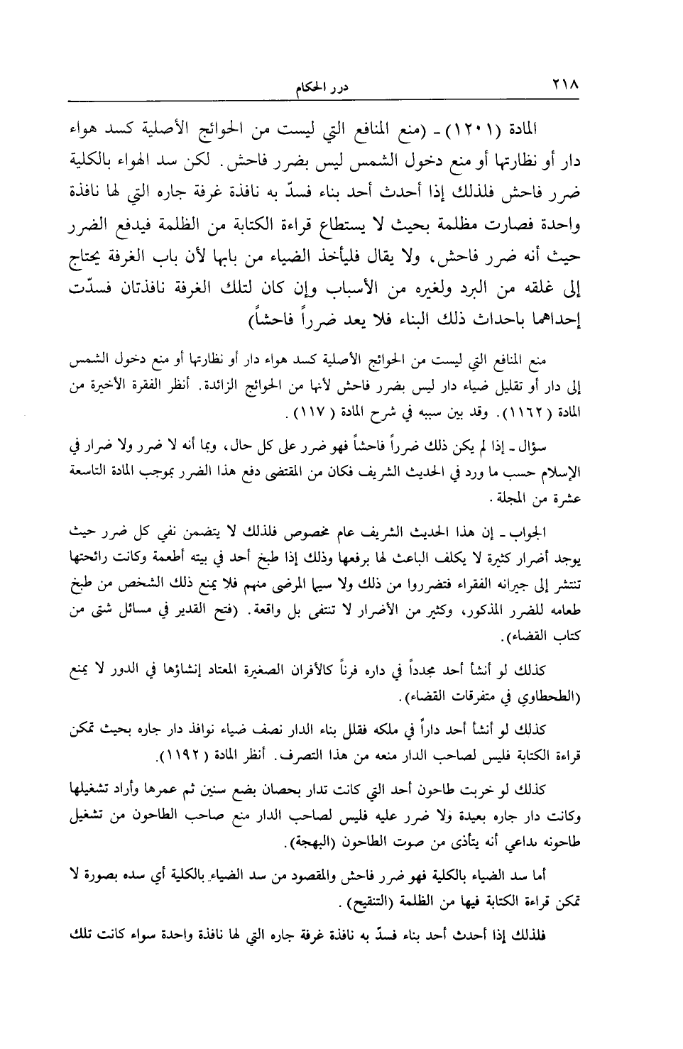 الْمَادَّةُ (1201) - (مَنْعُ الْمَنَافِعِ الَّتِي لَيْسَتْ مِنْ الْحَوَائِجِ الْأَصْلِيَّةِ كَسَدِّ هَوَاءِ دَارٍ أَوْ نَظَّارَتِهَا أَوْ مَنْعِ دُخُولِ الشَّمْسِ لَيْسَ بِضَرَرٍ فَاحِشٍ. لَكِنَّ سَدَّ الْهَوَاءِ بِالْكُلِّيَّةِ ضَرَرٌ فَاحِشٌ فَلِذَلِكَ إذَا أَحْدَثَ أَحَدٌ بِنَاءً فَسَدَّ بِهِ نَافِذَةَ غُرْفَةِ جَارِهِ الَّتِي لَهَا نَافِذَةٌ وَاحِدَةٌ فَصَارَتْ مُظْلِمَةً بِحَيْثُ لَا يُسْتَطَاعُ قِرَاءَةُ الْكِتَابَةِ مِنْ الظُّلْمَةِ فَيُدْفَعُ الضَّرَرُ حَيْثُ إنَّهُ ضَرَرٌ فَاحِشٌ، وَلَا يُقَالُ فَلْيَأْخُذْ الضِّيَاءَ مِنْ بَابِهَا لِأَنَّ بَابَ الْغُرْفَةِ يَحْتَاجُ إلَى غَلْقِهِ مِنْ الْبَرْدِ وَلِغَيْرِهِ مِنْ الْأَسْبَابِ وَإِنْ كَانَ لِتِلْكَ الْغُرْفَةِ نَافِذَتَانِ فَسُدَّتْ إحْدَاهُمَا بِإِحْدَاثِ ذَلِكَ الْبِنَاءِ فَلَا يُعَدُّ ضَرَرًا فَاحِشًا) .