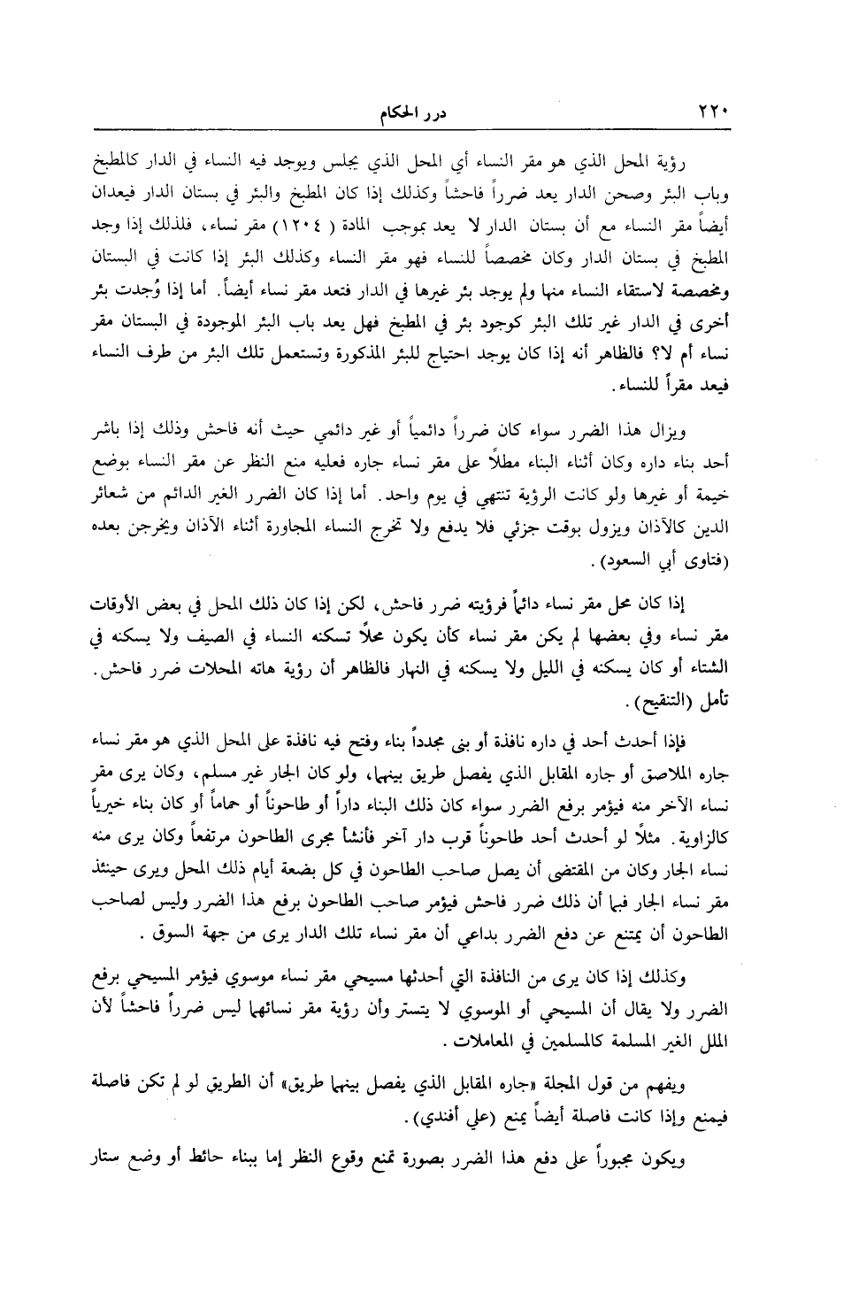رُؤْيَةُ الْمَحِلِّ الَّذِي هُوَ مَقَرُّ النِّسَاءِ أَيْ الْمَحِلِّ الَّذِي يَجْلِسُ وَيُوجَدُ فِيهِ النِّسَاءُ فِي الدَّارِ كَالْمَطْبَخِ وَبَابِ الْبِئْرِ وَصَحْنِ الدَّارِ يُعَدُّ ضَرَرًا فَاحِشًا وَكَذَلِكَ إذَا كَانَ الْمَطْبَخُ وَالْبِئْرُ فِي بُسْتَانِ الدَّارِ فَيُعَدَّانِ أَيْضًا مَقَرَّ النِّسَاءِ مَعَ أَنَّ بُسْتَانِ الدَّارِ لَا يُعَدُّ بِمُوجِبِ الْمَادَّةِ (1204) مَقَرَّ نِسَاءٍ، فَلِذَلِكَ إذَا وُجِدَ الْمَطْبَخُ فِي بُسْتَانِ الدَّار وَكَانَ مُخَصَّصًا لِلنِّسَاءِ فَهُوَ مَقَرُّ النِّسَاءِ وَكَذَلِكَ الْبِئْرُ إذَا كَانَتْ فِي الْبُسْتَانِ وَمُخَصَّصَةً لِاسْتِقَاءِ النِّسَاءِ مِنْهَا وَلَمْ يُوجَدْ بِئْرٌ غَيْرَهَا فِي الدَّارِ فَتُعَدُّ مَقَرُّ نِسَاءٍ أَيْضًا.