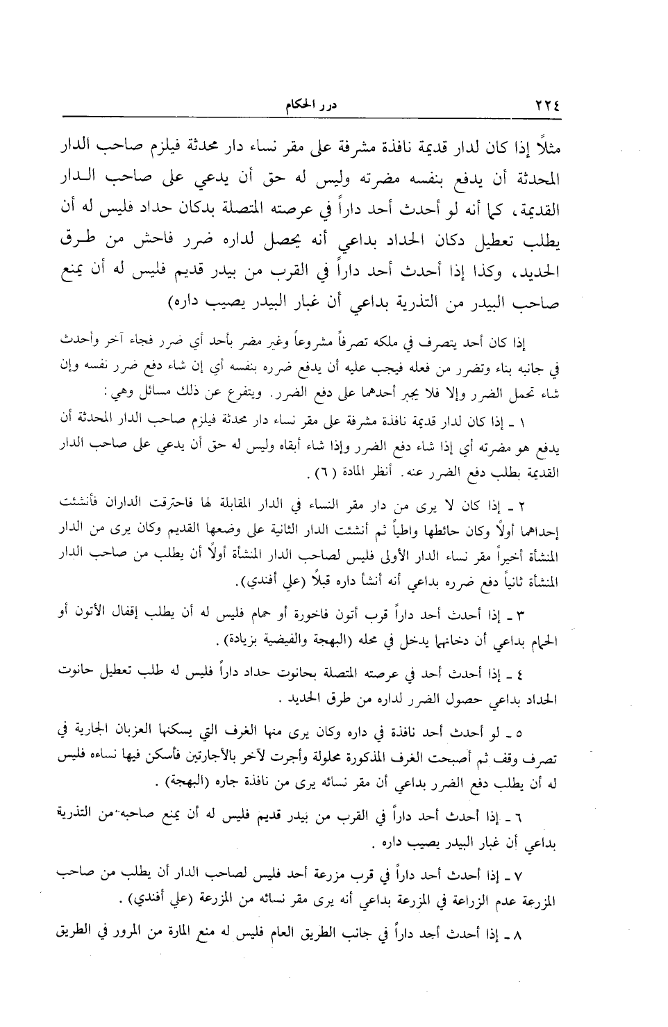 7 - إذَا أَحْدَثَ أَحَدٌ دَارًا فِي قُرْبِ مَزْرَعَةِ أَحَدٍ فَلَيْسَ لِصَاحِبِ الدَّارِ أَنْ يَطْلُبَ مِنْ صَاحِبِ الْمَزْرَعَةِ عَدَمَ الزِّرَاعَةِ فِي الْمَزْرَعَةِ بِدَاعِي أَنَّهُ يَرَى مَقَرَّ نِسَائِهِ مِنْ الْمَزْرَعَةِ (عَلِيٌّ أَفَنْدِي) .