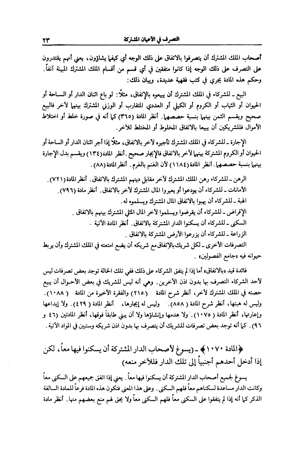 فَائِدَةٌ قَيْدُ (بِالِاتِّفَاقِ) أَمَّا إذَا لَمْ يَتَّفِقْ الشُّرَكَاءُ عَلَى ذَلِكَ فَفِي تِلْكَ الْحَالَةِ تُوجَدُ بَعْضُ تَصَرُّفَاتٍ لَيْسَ لِأَحَدِ الشُّرَكَاءِ التَّصَرُّفُ بِهَا بِدُونِ إذْنِ الْآخَرِينَ. وَهِيَ أَنَّهُ لَيْسَ لِلشَّرِيكِ فِي بَعْضِ الْأَحْوَالِ أَنْ يَبِيعَ حِصَّتَهُ فِي الْمِلْكِ الْمُشْتَرَكِ لِآخَرَ، اُنْظُرْ شَرْحَ الْمَادَّةِ (215) وَالْفِقْرَةَ الْأَخِيرَةَ مِنْ الْمَادَّةِ (1088) . وَلَيْسَ لَهُ هِبَتُهَا، اُنْظُرْ شَرْحَ الْمَادَّةِ (858) . وَلَيْسَ لَهُ إيجَارُهَا، اُنْظُرْ الْمَادَّةَ (429) . وَلَا إيدَاعُهَا وَإِعَارَتُهَا، اُنْظُرْ الْمَادَّةَ (1075) . وَلَا هَدْمُهَا وَإِنْشَاؤُهَا وَلَا أَنْ يَبْنِيَ طَابَقًا فَوْقَهَا، اُنْظُرْ الْمَادَّتَيْنِ (46 و 96) . كَمَا أَنَّهُ تُوجَدُ بَعْضُ تَصَرُّفَاتٍ لِلشَّرِيكِ أَنْ يَتَصَرَّفَ بِهَا بِدُونِ إذْنِ شَرِيكِهِ وَسَتُبَيَّنُ فِي الْمَوَادِّ الْآتِيَةِ.