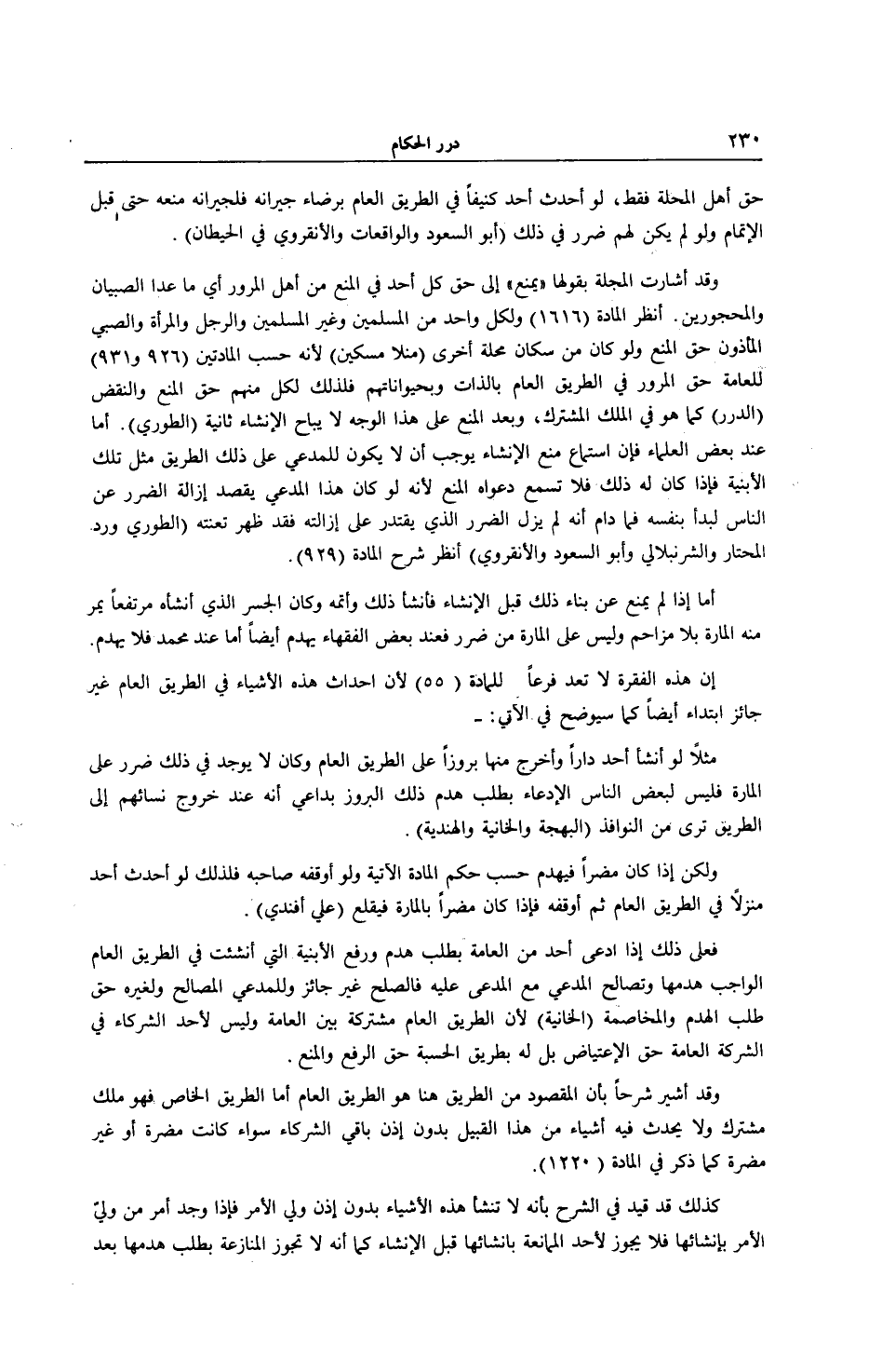 وَقَدْ أُشِيرَ شَرْحًا بِأَنَّ الْمَقْصُودَ مِنْ الطَّرِيقِ هُنَا هُوَ الطَّرِيقُ الْعَامُّ أَمَّا الطَّرِيقُ الْخَاصُّ فَهُوَ مِلْكٌ مُشْتَرَكٌ وَلَا يَحْدُثُ فِيهِ أَشْيَاءُ مِنْ هَذَا الْقَبِيلِ بِدُونِ إذْنِ بَاقِي الشُّرَكَاءِ سَوَاءٌ كَانَتْ مُضِرَّةً أَوْ غَيْرَ مُضِرَّةٍ كَمَا ذُكِرَ فِي الْمَادَّةِ (220 1) .
