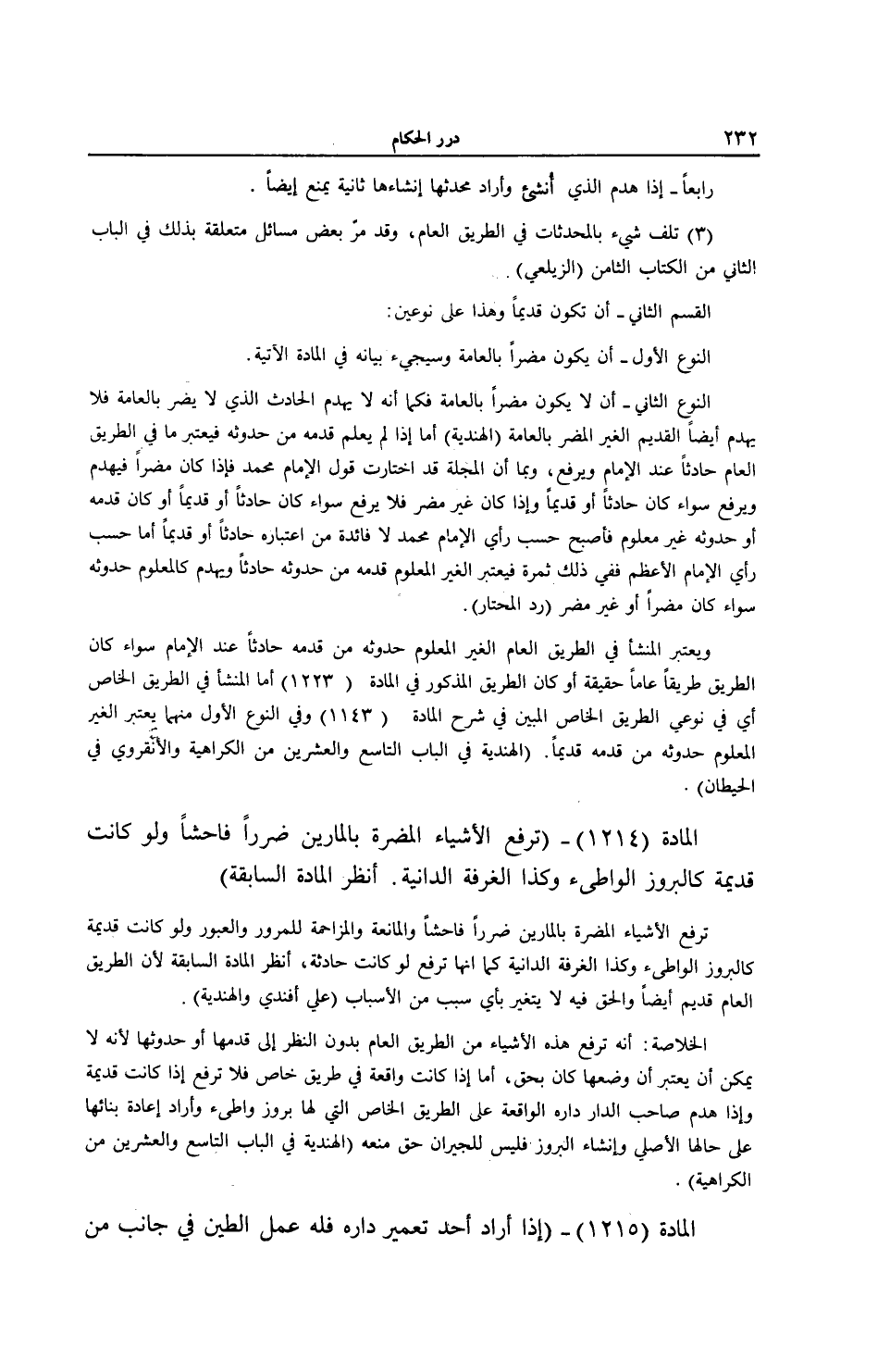 [ (الْمَادَّةُ 1214) تُرْفَعُ الْأَشْيَاءُ الْمُضِرَّةُ بِالْمَارِّينَ ضَرَرًا فَاحِشًا]
