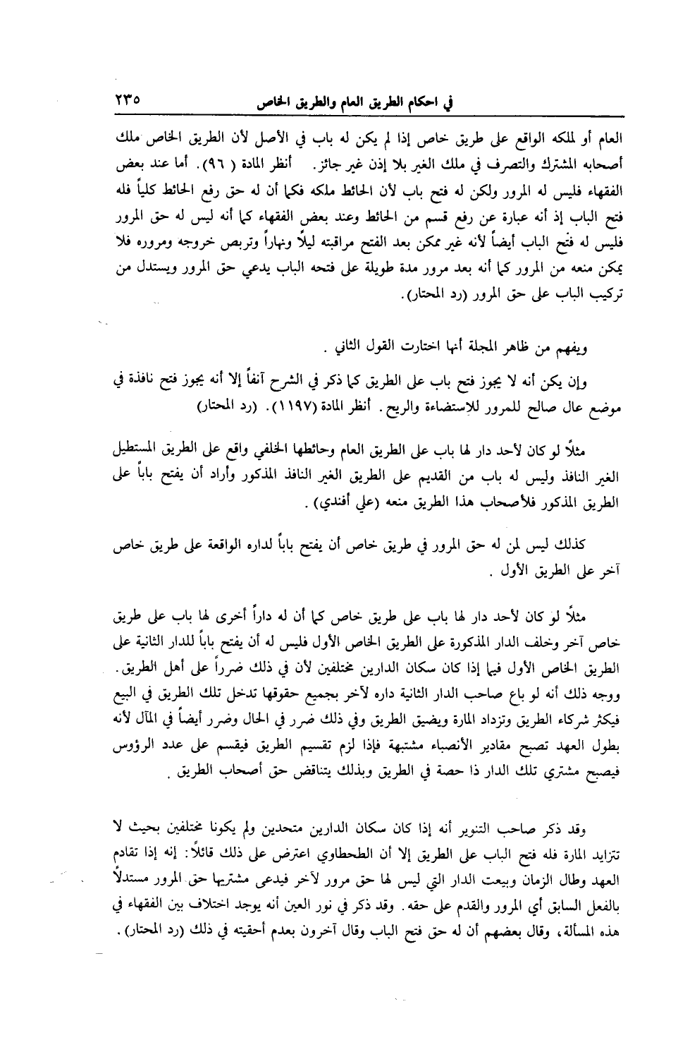 الْعَامِّ أَوْ لِمِلْكِهِ الْوَاقِعِ عَلَى طَرِيقٍ خَاصٍّ إذَا لَمْ يَكُنْ لَهُ بَابٌ فِي الْأَصْلِ لِأَنَّ الطَّرِيقَ الْخَاصَّ مِلْكُ أَصْحَابِهِ الْمُشْتَرَكُ وَالتَّصَرُّفُ فِي مِلْكِ الْغَيْرِ بِلَا إذْنٍ غَيْرُ جَائِزٍ. اُنْظُرْ الْمَادَّةَ (96) . أَمَّا عِنْدَ بَعْضِ الْفُقَهَاءِ فَلَيْسَ لَهُ الْمُرُورُ وَلَكِنْ لَهُ فَتْحُ بَابٍ لِأَنَّ الْحَائِطَ مِلْكُهُ فَكَمَا أَنَّ لَهُ حَقَّ رَفْعِ الْحَائِطِ كُلِّيًّا فَلَهُ فَتْحُ الْبَابِ إذْ أَنَّهُ عِبَارَةٌ عَنْ رَفْعِ قِسْمٍ مِنْ الْحَائِطِ وَعِنْدَ بَعْضِ الْفُقَهَاءِ كَمَا أَنَّهُ لَيْسَ لَهُ حَقُّ الْمُرُورِ فَلَيْسَ لَهُ فَتْحُ الْبَابِ أَيْضًا لِأَنَّهُ غَيْرُ مُمْكِنٍ بَعْدَ الْفَتْحِ مُرَاقَبَتُهُ لَيْلًا وَنَهَارًا وَتَرَبُّصُ خُرُوجِهِ وَمُرُورِهِ فَلَا يُمْكِنُ مَنْعُهُ مِنْ الْمُرُورِ كَمَا أَنَّهُ بَعْدَ مُرُورِ مُدَّةٍ طَوِيلَةٍ عَلَى فَتْحِهِ الْبَابِ يَدَّعِي حَقَّ الْمُرُورِ وَيَسْتَدِلُّ مِنْ تَرْكِيبِ الْبَابِ عَلَى حَقِّ الْمُرُورِ (رَدُّ الْمُحْتَارِ) .
