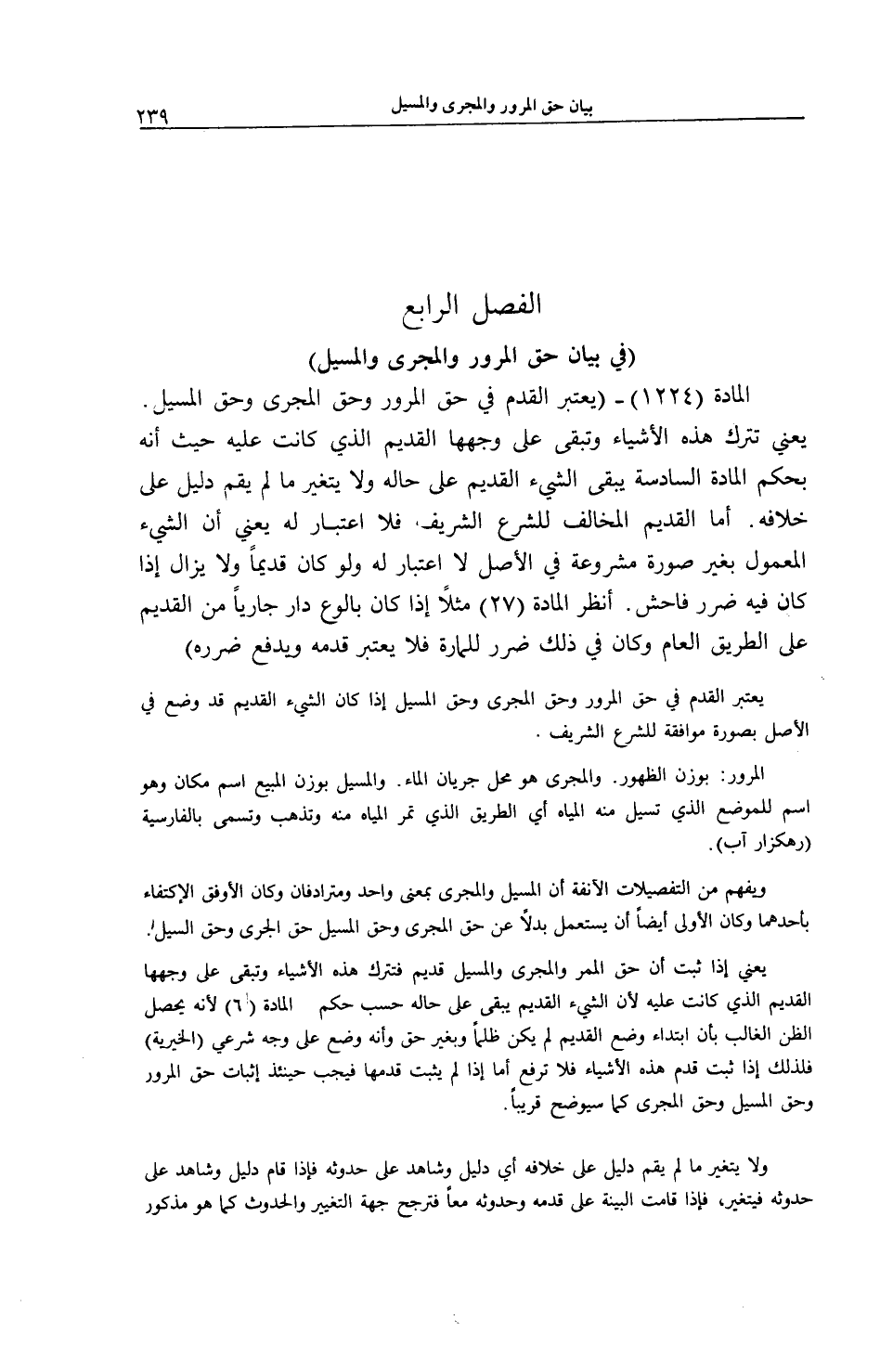 الْمُرُورُ: بِوَزْنِ الظُّهُورِ. وَالْمَجْرَى هُوَ مَحِلُّ جَرَيَانِ الْمَاءِ. وَالْمَسِيلُ بِوَزْنِ الْمَبِيعِ اسْمُ مَكَان وَهُوَ اسْمٌ لِلْمَوْضِعِ الَّذِي تَسِيلُ مِنْهُ الْمِيَاهُ أَيْ الطَّرِيقُ الَّذِي تَمُرُّ - الْمِيَاهُ مِنْهُ وَتَذْهَبُ وَتُسَمَّى بِالْفَارِسِيَّةِ (رهكزار آبَ) . وَيُفْهَمُ مِنْ التَّفْصِيلَاتِ الْآنِفَةِ أَنَّ الْمَسِيلَ وَالْمَجْرَى بِمَعْنًى - وَاحِدٍ وَمُتَرَادِفَانِ وَكَانَ الْأَوْفَقُ الِاكْتِفَاءَ بِأَحَدِهِمَا وَكَانَ الْأَوْلَى أَيْضًا أَنْ يُسْتَعْمَلَ بَدَلًا عَنْ حَقِّ الْمَجْرَى وَحَقِّ الْمَسِيلِ حَقُّ الْجَرْيِ وَحَقُّ السَّيْلِ يَعْنِي إذَا ثَبَتَ أَنَّ حَقَّ الْمَمَرِّ وَالْمَجْرَى وَالْمَسِيلِ قَدِيمٌ فَتُتْرَكُ هَذِهِ الْأَشْيَاءُ وَتَبْقَى عَلَى وَجْهِهَا الْقَدِيمِ الَّذِي كَانَتْ عَلَيْهِ لِأَنَّ الشَّيْءَ الْقَدِيمَ يَبْقَى عَلَى حَالِهِ حَسْبَ حُكْمِ الْمَادَّةِ (6) لِأَنَّهُ يَحْصُلُ الظَّنُّ الْغَالِبُ بِأَنَّ ابْتِدَاءَ وَضْعِ الْقَدِيمِ لَمْ يَكُنْ ظُلْمًا وَبِغَيْرِ حَقٍّ وَأَنَّهُ وُضِعَ عَلَى وَجْهٍ شَرْعِيٍّ (الْخَيْرِيَّةُ) فَلِذَلِكَ إذَا ثَبَتَ قِدَمُ هَذِهِ الْأَشْيَاءِ فَلَا تُرْفَعُ أَمَّا إذَا لَمْ يَثْبُتْ قِدَمُهَا فَيَجِبُ حِينَئِذٍ إثْبَاتُ حَقِّ الْمُرُورِ وَحَقُّ الْمَسِيلِ وَحَقُّ الْمَجْرَى كَمَا سَيُوَضَّحُ قَرِيبًا. .