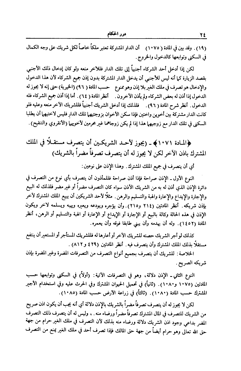 وَقَدْ بَيَّنَ فِي الْمَادَّةِ (1075) أَنَّ الدَّارَ الْمُشْتَرَكَةَ تُعْتَبَرُ مِلْكًا خَاصًّا لِكُلِّ شَرِيكٍ عَلَى وَجْهِ الْكَمَالِ فِي السُّكْنَى وتَوَابِعِهَا كَالدُّخُولِ وَالْخُرُوجِ.