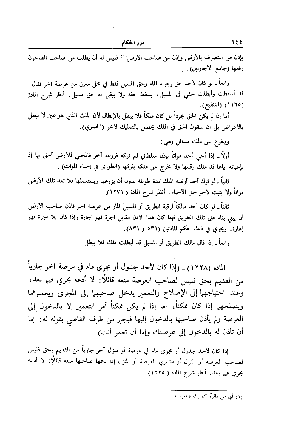 رَابِعًا - لَوْ كَانَ لِأَحَدٍ حَقُّ إجْرَاءِ الْمَاءِ وَحَقُّ الْمَسِيلِ فَقَطْ فِي مَحِلٍّ مُعَيَّنٍ مِنْ عَرْصَةِ آخَرَ فَقَالَ: قَدْ أَسْقَطْت وَأَبْطَلْتُ حَقِّي فِي الْمَسِيلِ، يَسْقُطُ حَقُّهُ وَلَا يَبْقَى لَهُ حَقُّ مَسِيلٍ. اُنْظُرْ شَرْحَ الْمَادَّةِ (65 1 1) (التَّنْقِيحُ) . أَمَّا إذَا لَمْ يَكُنْ الْحَقُّ مُجَرَّدًا بَلْ كَانَ مِلْكًا فَلَا يَبْطُلُ بِالْإِبْطَالِ لِأَنَّ الْمِلْكَ الَّذِي هُوَ عَيْنٌ لَا يَبْطُلُ بِالْأَعْرَاضِ بَلْ إنَّ سُقُوطَ الْحَقِّ فِي الْمِلْكِ يَحْصُلُ بِالتَّمْلِيكِ لِآخَرَ (الْحَمَوِيُّ) .