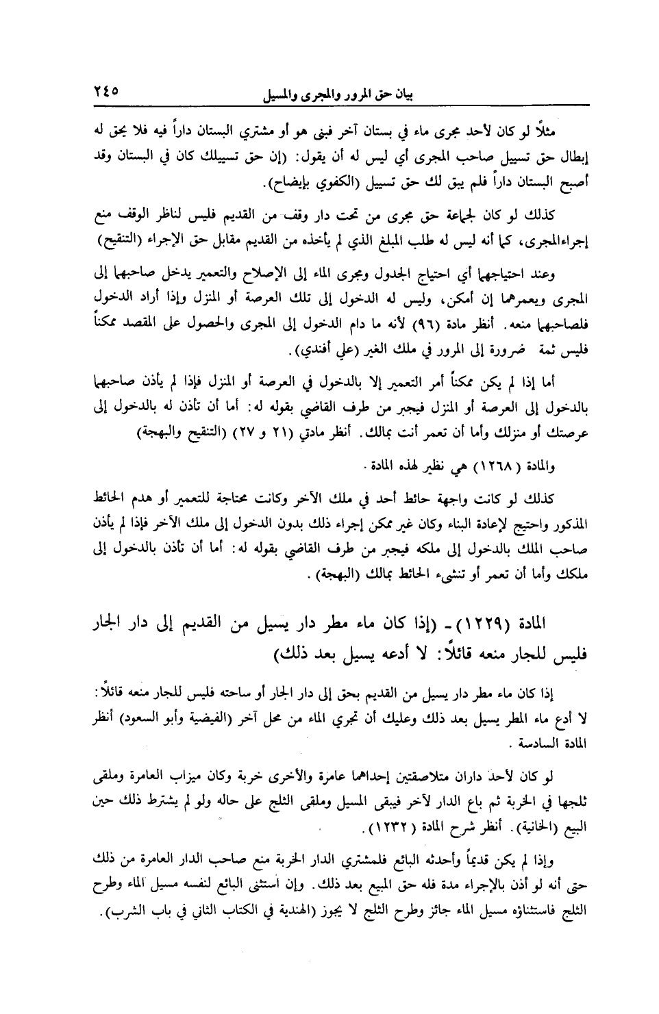 [ (الْمَادَّةُ 1229) مَاءُ مَطَرِ دَارٍ يَسِيلُ مِنْ الْقَدِيمِ إلَى دَارِ الْجَارِ]