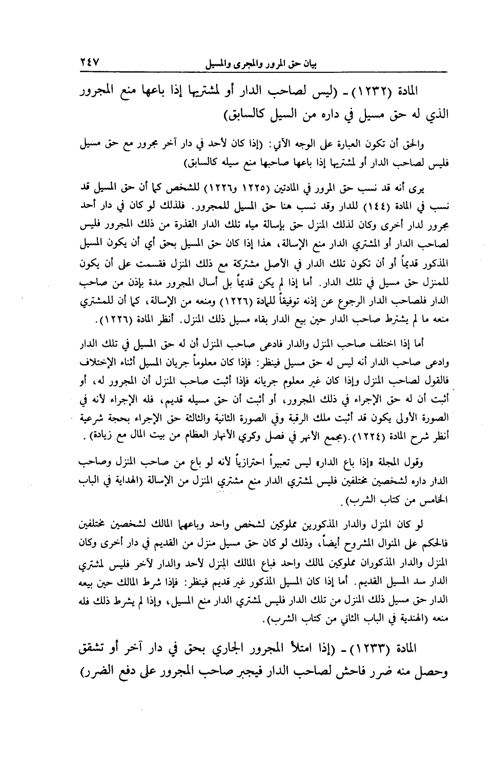 يُرَى أَنَّهُ قَدْ نَسَبَ حَقَّ الْمُرُورِ فِي الْمَادَّتَيْنِ (225 1 و 226 1) لِلشَّخْصِ كَمَا أَنَّ حَقَّ الْمَسِيلِ قَدْ نُسِبَ فِي الْمَادَّةِ (44 1) لِلدَّارِ وَقَدْ نُسِبَ هُنَا حَقُّ الْمَسِيلِ لِلْمَجْرُورِ. فَلِذَلِكَ لَوْ كَانَ فِي دَارِ أَحَدٍ مَجْرُورٌ لِدَارٍ أُخْرَى وَكَانَ لِذَلِكَ الْمَنْزِلِ حَقٌّ بِإِسَالَةِ مِيَاهِ تِلْكَ الدَّارِ الْقَذِرَةِ مِنْ ذَلِكَ الْمَجْرُورِ فَلَيْسَ لِصَاحِبِ الدَّارِ أَوْ الْمُشْتَرِي الدَّارَ مَنْعُ الْإِسَالَةِ، هَذَا إذَا كَانَ حَقُّ الْمَسِيلِ بِحَقٍّ أَيْ أَنْ يَكُونَ الْمَسِيلُ الْمَذْكُورُ قَدِيمًا أَوْ أَنْ تَكُونَ تِلْكَ الدَّارُ فِي الْأَصْلِ مُشْتَرَكَةً مَعَ ذَلِكَ الْمَنْزِلِ فَقُسِّمَتْ عَلَى أَنْ يَكُونَ لِلْمَنْزِلِ حَقُّ مَسِيلٍ فِي تِلْكَ الدَّارِ. أَمَّا إذَا لَمْ يَكُنْ قَدِيمًا بَلْ أَسَالَ الْمَجْرُورَ مُدَّةً بِإِذْنٍ مِنْ صَاحِبِ الدَّارِ فَلِصَاحِبِ الدَّارِ الرُّجُوعُ عَنْ إذْنِهِ تَوْفِيقًا لِلْمَادَّةِ (226 1) وَمَنْعُهُ مِنْ الْإِسَالَةِ، كَمَا أَنَّ لِلْمُشْتَرِي مَنْعَهُ مَا لَمْ يَشْتَرِطْ صَاحِبُ الدَّارِ حِينَ بَيْعِ الدَّارِ بَقَاءَ مَسِيلِ ذَلِكَ الْمَنْزِلِ. اُنْظُرْ الْمَادَّةَ (226 1) .