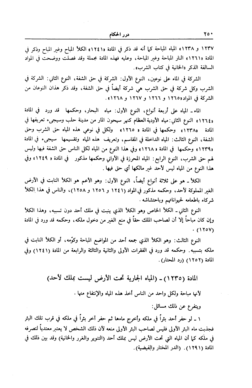 الْمَاءُ - الْمِيَاهُ عَلَى أَرْبَعَةِ أَنْوَاعٍ، النَّوْعُ الْأَوَّلُ: مِيَاهُ الْبِحَارِ، وَحُكْمُهَا قَدْ وَرَدَ فِي الْمَادَّةِ (4 26 1) النَّوْعُ الثَّانِي: مِيَاهُ الْأَوْدِيَةِ الْعِظَامِ كَنَهْرِ سَيْحُونَ الْمَارِّ مِنْ مَدِينَةِ حَلَبَ وَسَيَجِيءُ تَعْرِيفُهَا فِي الْمَادَّةِ (1238) وَحُكْمُهَا فِي الْمَادَّةِ (1265) وَلِكُلٍّ فِي نَوْعَيْ هَذِهِ الْمِيَاهِ حَقُّ الشُّرْبِ وَحَقُّ الشَّفَةِ، النَّوْعُ الثَّالِثُ: الْمِيَاهُ الدَّاخِلَةُ فِي الْمُقَاسِمِ، وَتَعْرِيفُ هَذِهِ الْمِيَاهِ وَتَقْسِيمُهَا سَيَجِيءُ فِي الْمَادَّةِ (239 1) وَحُكْمُهَا فِي الْمَادَّةِ (268 1) وَفِي هَذَا النَّوْعِ مِنْ الْمِيَاهِ لِكُلِّ النَّاسِ حَقُّ الشَّفَةِ فِيهَا وَلَيْسَ لَهُمْ حَقُّ الشُّرْبِ، النَّوْعُ الرَّابِعُ: الْمِيَاهُ الْمُحْرَزَةُ فِي الْأَوَانِي وَحُكْمُهَا مَذْكُورٌ فِي الْمَادَّةِ (249 1) وَفِي هَذَا النَّوْعِ مِنْ الْمِيَاهِ لَيْسَ لِأَحَدٍ غَيْرَ مَالِكِهَا أَيُّ حَقٍّ فِيهَا.