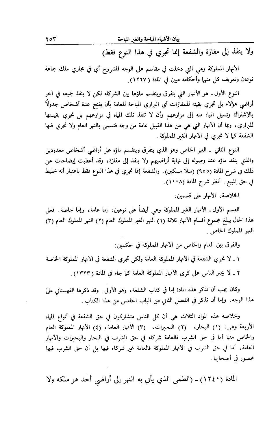 1 - لَا تَجْرِي الشُّفْعَةُ فِي الْأَنْهَارِ الْمَمْلُوكَةِ الْعَامَّةِ وَلَكِنْ تَجْرِي الشُّفْعَةُ فِي الْأَنْهَارِ الْمَمْلُوكَةِ الْخَاصَّةِ.