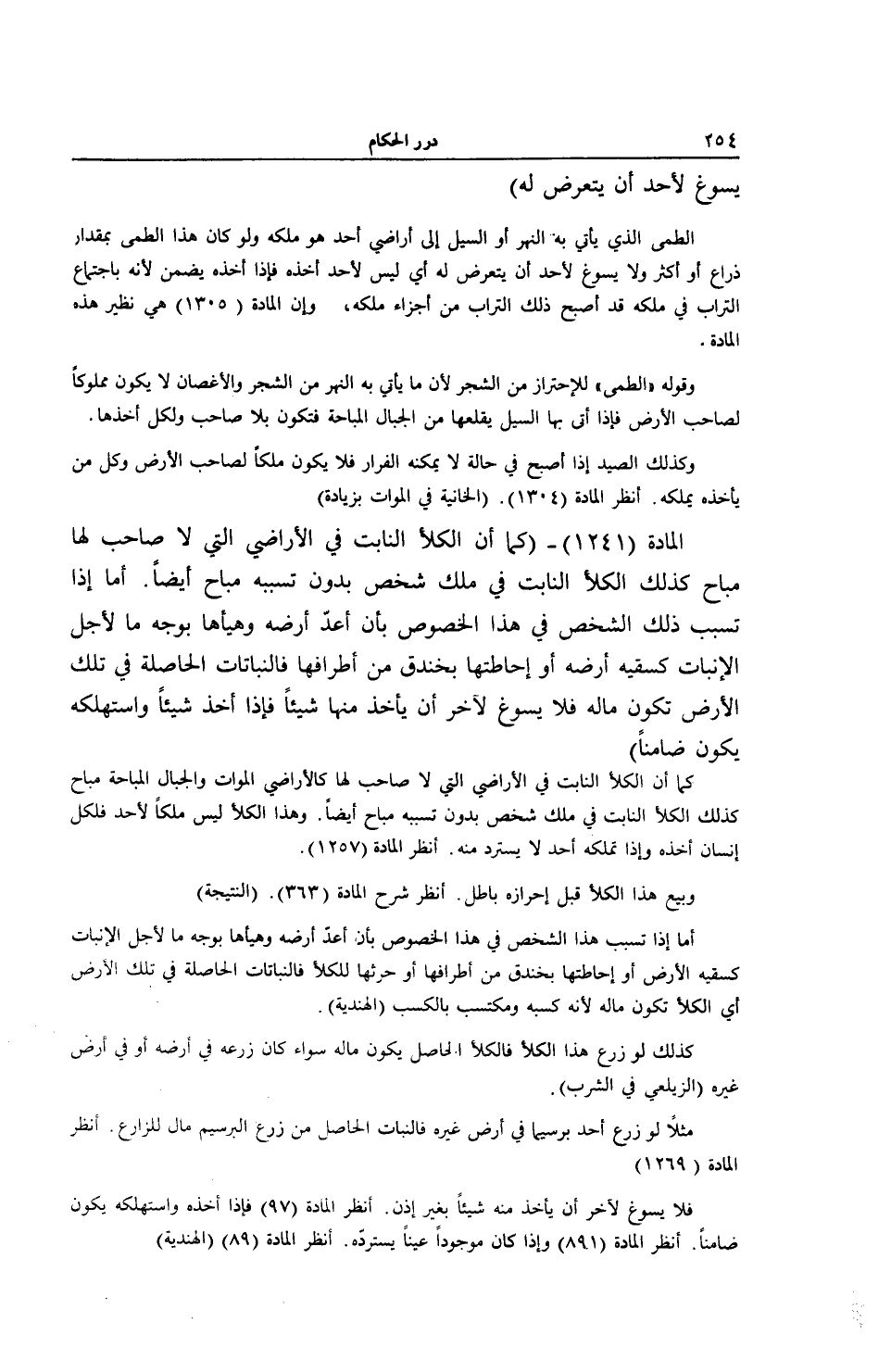 كَمَا أَنَّ الْكَلَأَ النَّابِتَ فِي الْأَرَاضِي الَّتِي لَا صَاحِبَ لَهَا كَالْأَرَاضِيِ الْمَوَاتِ وَالْجِبَالِ الْمُبَاحَةِ مُبَاحٌ كَذَلِكَ الْكَلَأُ النَّابِتُ فِي مِلْكِ شَخْصٍ بِدُونِ تَسَبُّبِهِ مُبَاحٌ أَيْضًا، وَهَذَا الْكَلَأُ لَيْسَ مِلْكًا لِأَحَدٍ فَلِكُلِّ إنْسَانٍ أَخْذُهُ وَإِذَا تَمَلَّكَهُ أَحَدٌ لَا يُسْتَرَدُّ مِنْهُ. اُنْظُرْ الْمَادَّةَ (257 1) . وَبَيْعُ هَذَا الْكَلَأِ قَبْلَ إحْرَازِهِ بَاطِلٌ. اُنْظُرْ شَرْحَ الْمَادَّةِ (363) . (النَّتِيجَةُ) .