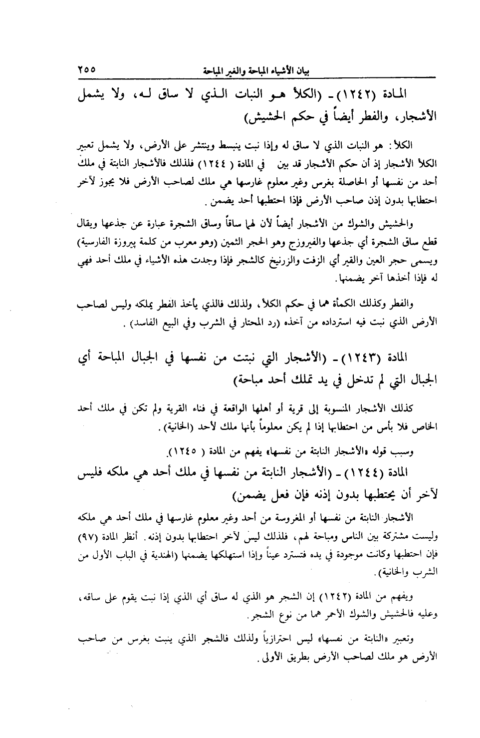 [ (الْمَادَّةُ 1244) الْأَشْجَارُ النَّابِتَةُ مِنْ نَفْسِهَا فِي مِلْكِ أَحَدٍ هِيَ مِلْكُهُ]