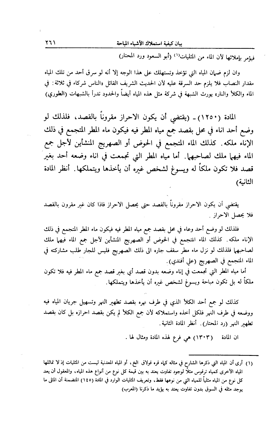 . الْمَادَّةُ (0 25 1) - (يَقْتَضِي أَنْ يَكُونَ الْإِحْرَازُ مَقْرُونًا بِالْقَصْدِ، فَلِذَلِكَ لَوْ وَضَعَ أَحَدٌ إنَاءٍ فِي مَحِلٍّ بِقَصْدِ جَمْعِ مِيَاهِ الْمَطَرِ فِيهِ فَيَكُونُ مَاءُ الْمَطَرِ الْمُتَجَمِّعِ فِي ذَلِكَ الْإِنَاءِ مِلْكَهُ. كَذَلِكَ الْمَاءُ الْمُتَجَمِّعُ فِي الْحَوْضِ أَوْ الصِّهْرِيجِ الْمُنْشَأَيْنِ لِأَجَلِ جَمْعِ الْمَاءِ فِيهِمَا مِلْكٌ لِصَاحِبِهِمَا. أَمَّا مِيَاهُ الْمَطَرِ الَّتِي تَجَمَّعَتْ فِي إنَاءٍ وَضَعَهُ أَحَدٌ بِغَيْرِ قَصْدٍ فَلَا تَكُونُ مِلْكًا لَهُ وَيَسُوغُ لِشَخْصٍ غَيْرِهِ أَنْ يَأْخُذَهَا وَيَتَمَلَّكَهَا. اُنْظُرْ الْمَادَّةَ الثَّانِيَةَ) .