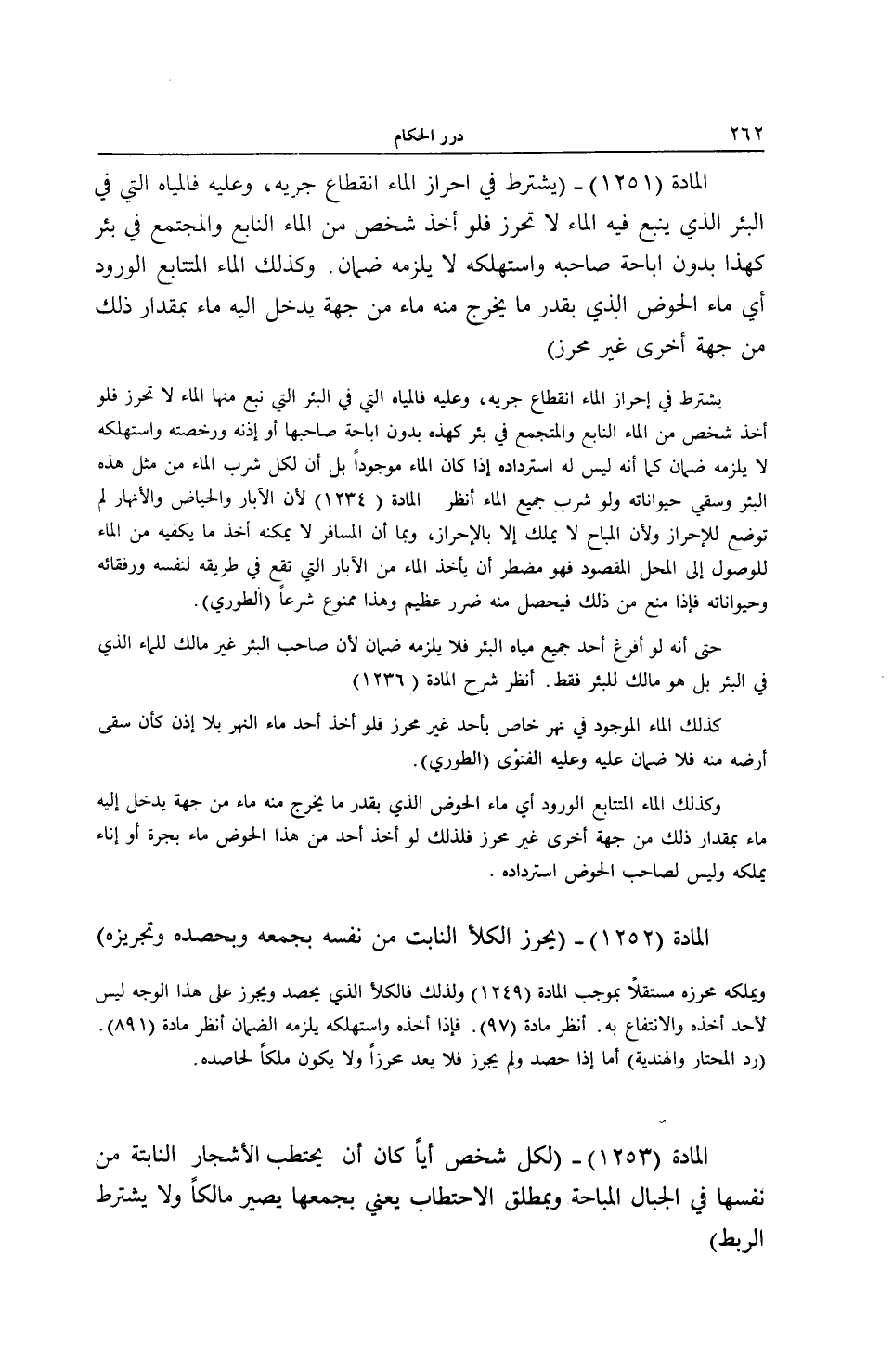 حَتَّى أَنَّهُ لَوْ أَفْرَغَ أَحَدٌ جَمِيعَ مِيَاهِ الْبِئْرِ فَلَا يَلْزَمُهُ ضَمَانٌ لِأَنَّ صَاحِبَ الْبِئْرِ غَيْرُ مَالِكٍ لِلْمَاءِ الَّذِي فِي الْبِئْرِ بَلْ هُوَ مَالِكٌ لِلْبِئْرِ فَقَطْ. اُنْظُرْ شَرْحَ الْمَادَّةِ (1236) كَذَلِكَ الْمَاءُ الْمَوْجُودُ فِي نَهْرٍ خَاصٍّ بِأَحَدٍ غَيْرِ مُحَرَّزٍ فَلَوْ أَخَذَ أَحَدٌ مَاءَ النَّهْرِ بِلَا إذْنٍ كَأَنْ سَقَى أَرْضَهُ مِنْهُ فَلَا ضَمَانَ عَلَيْهِ وَعَلَيْهِ الْفَتْوَى (الطُّورِيُّ) .