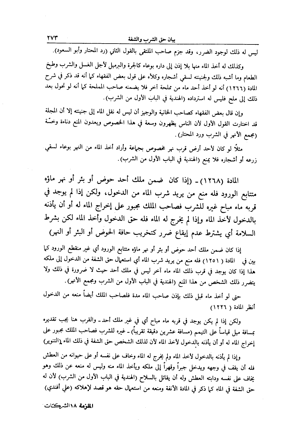 [ (الْمَادَّةُ 1268) إذَا كَانَ ضِمْنَ مِلْكِ أَحَدٍ حَوْضٌ أَوْ بِئْرٌ أَوْ نَهْرٌ مَاؤُهُ مُتَتَابِعُ الْوُرُودِ]