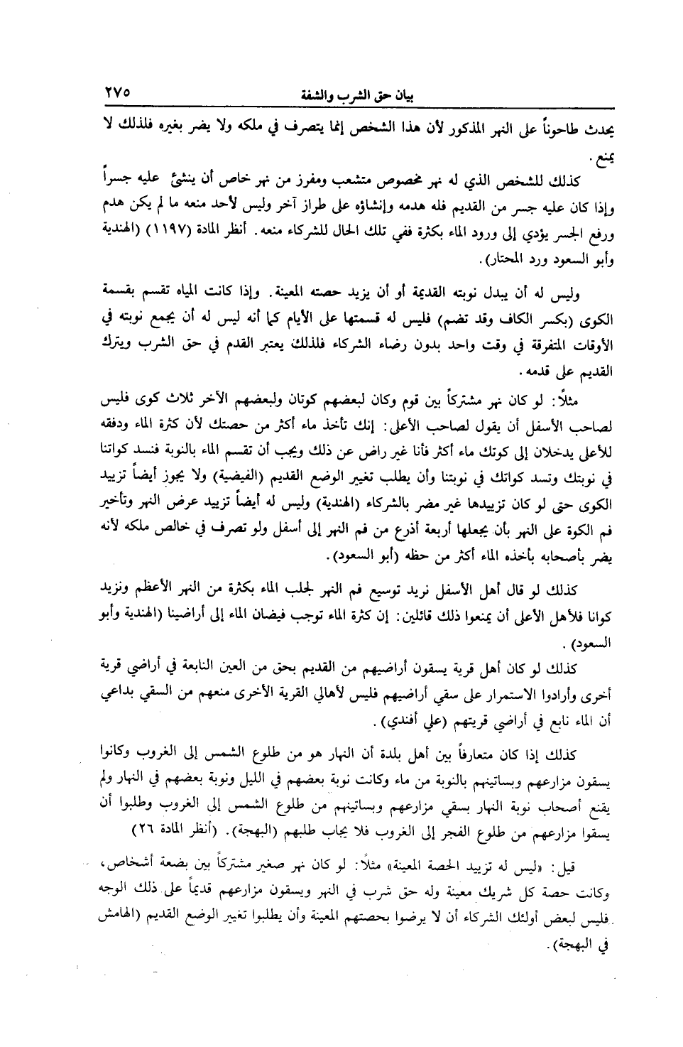 قِيلَ: " لَيْسَ لَهُ تَزْيِيدُ الْحِصَّةِ الْمُعَيَّنَةِ " مَثَلًا: لَوْ كَانَ نَهْرٌ صَغِيرٌ مُشْتَرَكًا بَيْنَ بِضْعَةِ أَشْخَاصٍ وَكَانَتْ حِصَّةُ كُلِّ شَرِيكٍ مُعَيَّنَةً وَلَهُ حَقُّ شِرْبٍ فِي النَّهْرِ وَيَسْقُونَ مَزَارِعَهُمْ قَدِيمًا عَلَى ذَلِكَ الْوَجْهِ فَلَيْسَ لِبَعْضِ أُولَئِكَ الشُّرَكَاءِ أَنْ لَا يَرْضَوْا بِحِصَّتِهِمْ الْمُعَيَّنَةِ وَأَنْ يَطْلُبُوا تَغْيِيرَ الْوَضْعِ الْقَدِيمِ (الْهَامِشُ فِي الْبَهْجَةُ)