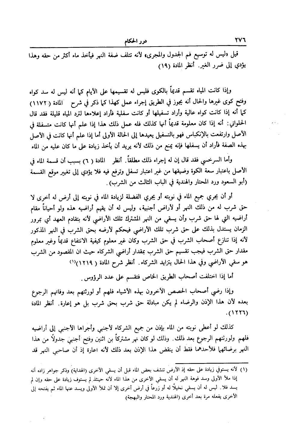 وَأَمَّا السَّرَخْسِيُّ فَقَدْ قَالَ: إنَّ لَهُ إجْرَاءَ ذَلِكَ مُطْلَقًا. اُنْظُرْ الْمَادَّةَ (6) بِسَبَبِ أَنَّ قِسْمَةَ الْمَاءِ فِي الْأَصْلِ بِاعْتِبَارِ سَعَةِ الْكُوَّةِ وَضِيقِهَا مِنْ غَيْرِ اعْتِبَارِ تَسَفُّلٍ وَتَرَفُّعٍ فِيهِ فَلَا يُؤَدِّي إلَى تَغْيِيرِ مَوْقِعِ الْقِسْمَةِ (أَبُو السُّعُودِ وَرَدُّ الْمُحْتَارِ وَالْهِنْدِيَّةُ فِي الْبَابِ الثَّالِثِ مِنْ الشُّرْبِ) . أَوْ أَنْ يُجْرِيَ جَمِيعَ الْمَاءِ فِي نَوْبَتِهِ أَوْ يُجْرِيَ الْفَضْلَةَ لِزِيَادَةِ الْمَاءِ فِي نَوْبَتِهِ إلَى أَرْضٍ لَهُ أُخْرَى لَا حَقَّ شِرْبٍ لَهُ مِنْ ذَلِكَ النَّهْرِ أَوْ لِأَرَاضٍ أَجْنَبِيَّةٍ، وَلَيْسَ لَهُ أَنْ يُقِيمَ أَرَاضِيَهُ هَذِهِ وَلَوْ أَحْيَانًا مُقَامَ أَرَاضِيهِ الَّتِي لَهَا حَقُّ شِرْبٍ وَأَنْ يَسْقِيَ مِنْ النَّهْرِ الْمُشْتَرَكِ تِلْكَ الْأَرَاضِيَ لِأَنَّهُ بِتَقَادُمِ الْعَهْدِ أَيْ بِمُرُورِ الزَّمَانِ يَسْتَدِلُّ بِذَلِكَ عَلَى حَقِّ شِرْبِ تِلْكَ الْأَرَاضِي فَيَحْكُمُ لِأَرْضِهِ بِحَقِّ الشِّرْبِ فِي النَّهْرِ الْمَذْكُورِ لِأَنَّهُ إذَا تَنَازَعَ أَصْحَابُ الشِّرْبِ فِي حَقِّ الشِّرْبِ وَكَانَ غَيْرَ مَعْلُومٍ كَيْفِيَّةُ الِانْتِفَاعِ قَدِيمًا وَغَيْرَ مَعْلُومٍ مِقْدَارُ حَقِّ الشِّرْبِ فَيَجِبُ تَقْسِيمُ حَقِّ الشِّرْبِ بِمِقْدَارِ أَرَاضِي الشُّرَكَاءِ حَيْثُ إنَّ الْمَقْصُودَ مِنْ الشِّرْبِ هُوَ سَقْيُ الْأَرَاضِي وَفِي هَذَا الْحَالِ يَتَزَايَدُ الشُّرَكَاءُ. اُنْظُرْ شَرْحَ الْمَادَّةِ (1219) .