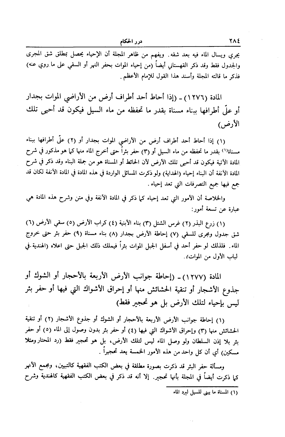وَيُفْهَمُ مِنْ ظَاهِرِ الْمَجَلَّةِ أَنَّ الْإِحْيَاءَ يَحْصُلُ بِمُطْلَقِ شَقِّ الْمَجْرَى وَالْجَدْوَلِ فَقَطْ وَقَدْ ذَكَرَ الْقُهُسْتَانِيُّ أَيْضًا (مِنْ إحْيَاءِ الْمَوَاتِ بِحَفْرِ النَّهْرِ أَوْ السَّقْيِ عَلَى مَا رُوِيَ عَنْهُ) فَذَكَرَ مَا قَالَتْهُ الْمَجَلَّةُ وَأَسْنَدَ هَذَا الْقَوْلَ لِلْإِمَامِ الْأَعْظَمِ.