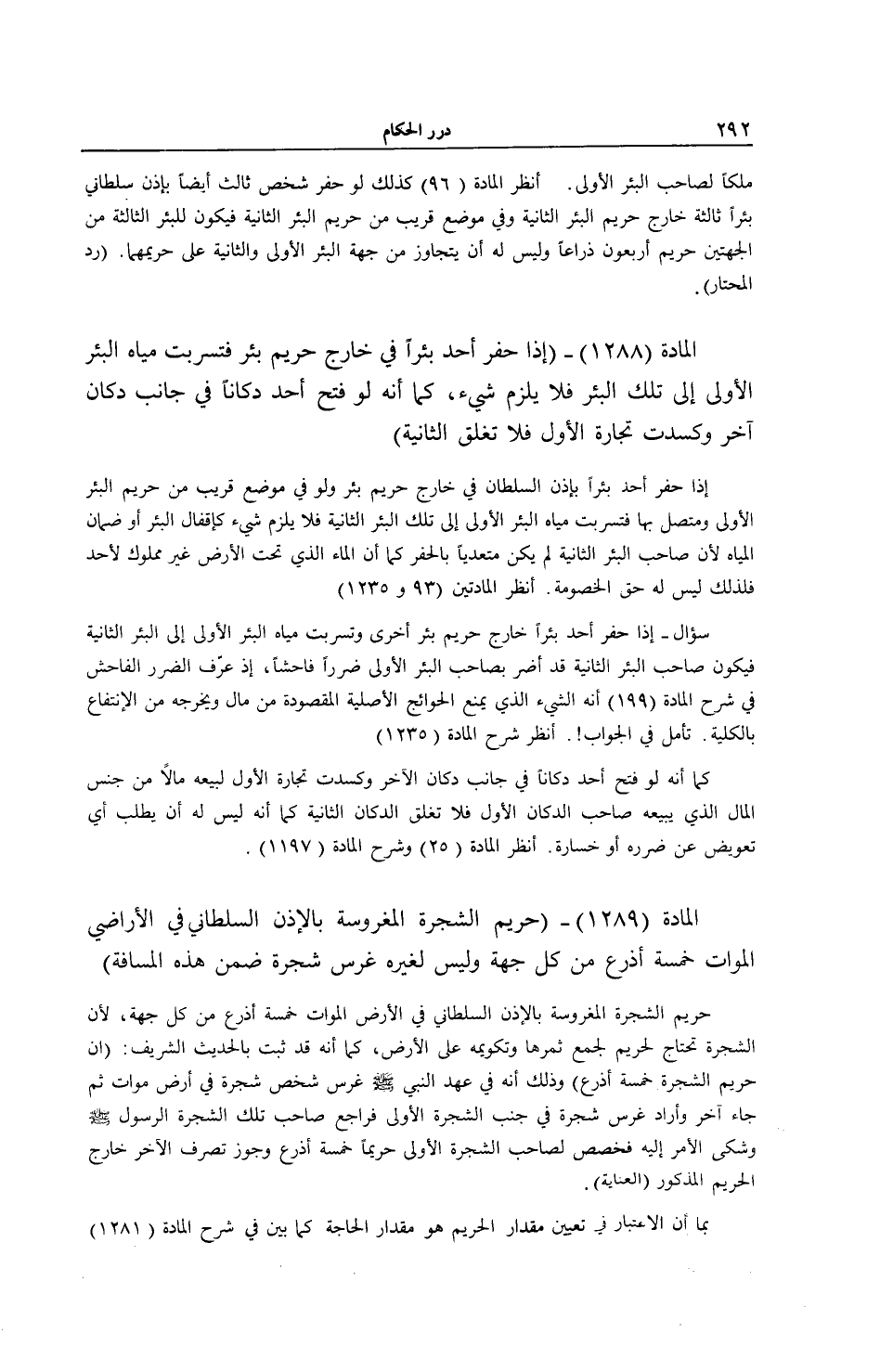مِلْكًا لِصَاحِبِ الْبِئْرِ الْأُولَى. اُنْظُرْ الْمَادَّةَ (96) كَذَلِكَ لَوْ حَفَرَ شَخْصٌ ثَالِثٌ أَيْضًا بِإِذْنٍ سُلْطَانِيٍّ بِئْرًا ثَالِثَةً خَارِجَ حَرِيمِ الْبِئْرِ الثَّانِيَةِ وَفِي مَوْضِعٍ قَرِيبٍ مِنْ حَرِيمِ الْبِئْرِ الثَّانِيَةِ فَيَكُونُ لِلْبِئْرِ الثَّالِثَةِ مِنْ الْجِهَتَيْنِ حَرِيمٌ أَرْبَعُونَ ذِرَاعًا وَلَيْسَ لَهُ أَنْ يَتَجَاوَزَ مِنْ جِهَةِ الْبِئْرِ الْأُولَى وَالثَّانِيَةُ عَلَى حَرِيمِهِمَا (رَدُّ الْمُحْتَارِ) .