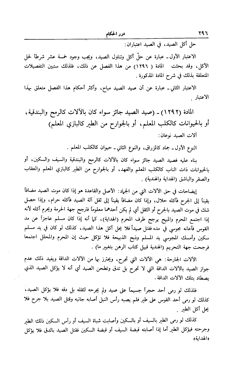 الْمَادَّةُ (1292) - (صَيْدُ الصَّيْدِ جَائِزٌ سَوَاءٌ كَانَ بِالْآلَاتِ كَالرُّمْحِ وَالْبُنْدُقِيَّةِ، أَوْ بِالْحَيَوَانَاتِ كَالْكَلْبِ الْمُعَلَّمِ، أَوْ بِالْجَوَارِحِ مِنْ الطَّيْرِ كَالْبَازِي الْمُعَلَّمِ) .