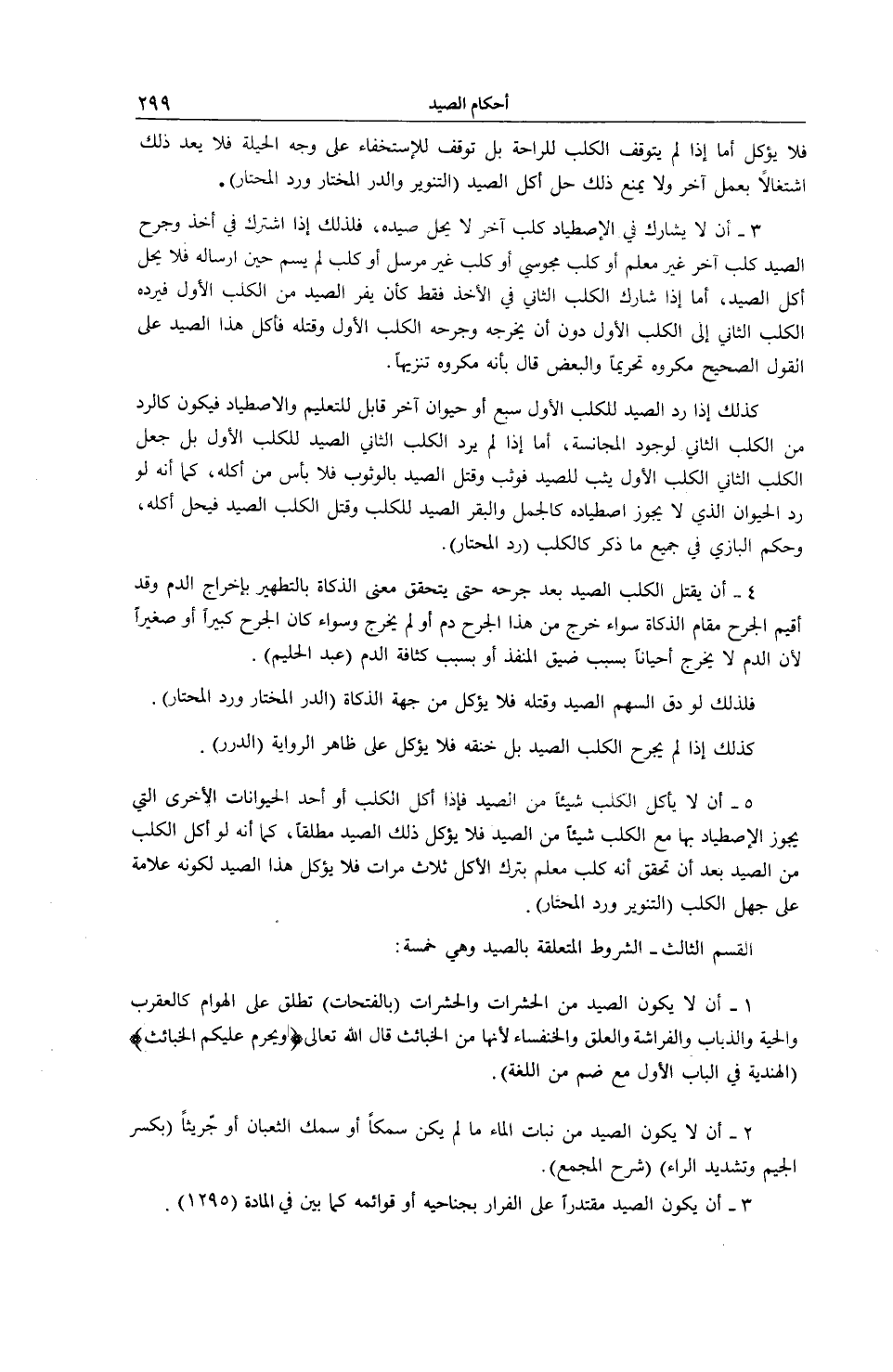 الْقِسْمُ الثَّالِثُ - الشُّرُوطُ الْمُتَعَلِّقَةُ بِالصَّيْدِ وَهِيَ خَمْسَةٌ: