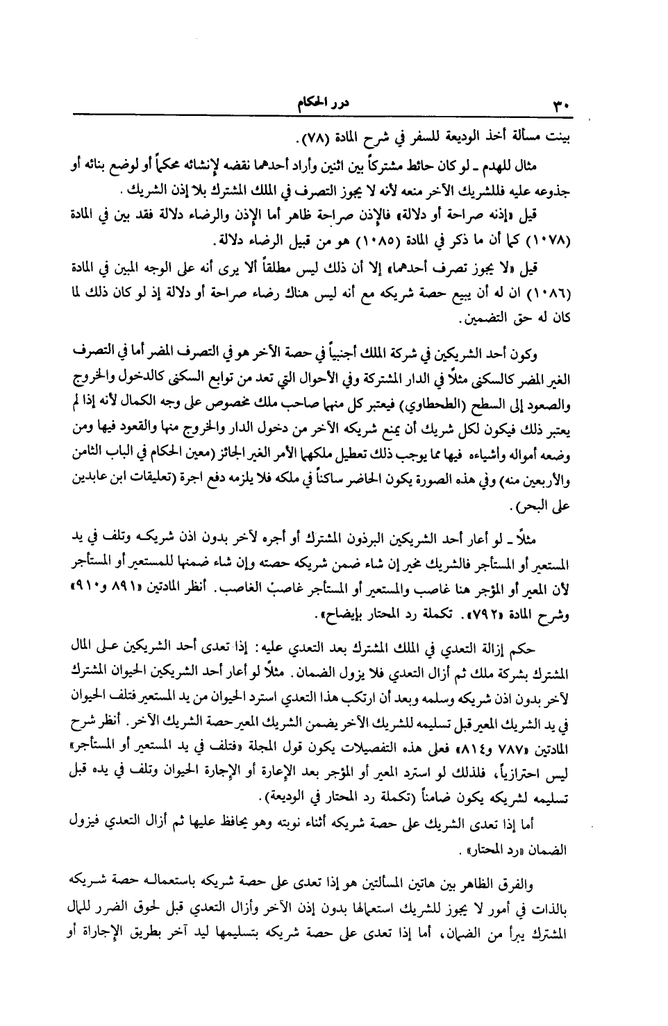 وَالْفَرْقُ الظَّاهِرُ بَيْنَ هَاتَيْنِ الْمَسْأَلَتَيْنِ هُوَ إذَا تَعَدَّى عَلَى حِصَّةِ شَرِيكِهِ بِاسْتِعْمَالِهِ حِصَّةَ شَرِيكِهِ بِالذَّاتِ فِي أُمُورٍ لَا يَجُوزُ لِلشَّرِيكِ اسْتِعْمَالُهَا بِدُونِ إذْنِ الْآخَرِ وَأَزَالَ التَّعَدِّيَ قَبْلَ لُحُوقِ الضَّرَرِ لِلْمَالِ الْمُشْتَرَكِ يَبْرَأُ مِنْ الضَّمَانِ أَمَّا إذَا تَعَدَّى عَلَى حِصَّةِ شَرِيكِهِ بِتَسْلِيمِهَا لِيَدِ آخَرَ بِطَرِيقِ الْإِجَارَةِ أَوْ