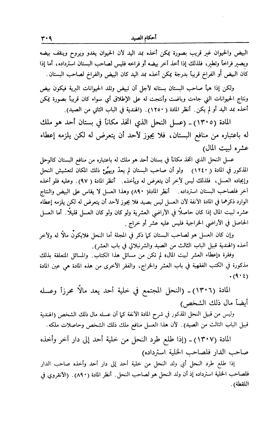 أَمَّا الْعَسَلُ الْحَاصِلُ فِي الْأَرَاضِي الْخَرَاجِيَّةِ فَلَيْسَ عَلَيْهِ عُشْرٌ أَوْ خَرَاجٌ وَإِنْ كَانَ الْعَسَلُ هُوَ لِصَاحِبِ الْبُسْتَانِ كَمَا ذُكِرَ فِي الْمَجَلَّةِ أَمَّا النَّحْلُ فَلَا يَكُونُ مَالًا لَهُ وَلِآخَرَ أَخْذُهُ (الْهِنْدِيَّةُ قُبَيْلَ الْبَابِ الثَّالِثِ مِنْ الصَّيْدِ والشرنبلالي فِي بَابِ الْعُشْرِ) . وَفِقْرَةُ " إعْطَاءُ الْعُشْرِ لِبَيْتِ الْمَالِ " لَمْ تَكُنْ مِنْ مَسَائِلِ هَذَا الْكِتَابِ. وَالْمَسَائِلُ الْمُتَعَلِّقَةُ بِذَلِكَ مَذْكُورَةٌ فِي الْكُتُبِ الْفِقْهِيَّةِ فِي بَابِ الْعُشْرِ وَالْخَرَاجِ، وَالْفِقَرُ الْأُخْرَى مِنْ هَذِهِ الْمَادَّةِ هِيَ عَيْنُ الْمَادَّةِ (940) الْمَادَّةُ (1306) - (النَّحْلُ الْمُجْتَمِعُ فِي خَلِيَّةِ أَحَدٍ يُعَدُّ مَالًا مُحْرَزًا وَعَسَلُهُ أَيْضًا مَالُ ذَلِكَ الشَّخْصِ) وَلَيْسَ مِنْ قَبِيلِ النَّحْلِ الْمَذْكُورِ فِي شَرْحِ الْمَادَّةِ الْآنِفَةِ كَمَا أَنَّ عَسَلَهُ مَالُ ذَلِكَ الشَّخْصِ (الْهِنْدِيَّةُ قُبَيْلَ الْبَابِ الثَّالِثِ مِنْ الصَّيْدِ) لِأَنَّ هَذَا الْعَسَلَ مَنَافِعُ مِلْكِ ذَلِكَ الشَّخْصِ وَحَاصِلَاتُ مِلْكِهِ.