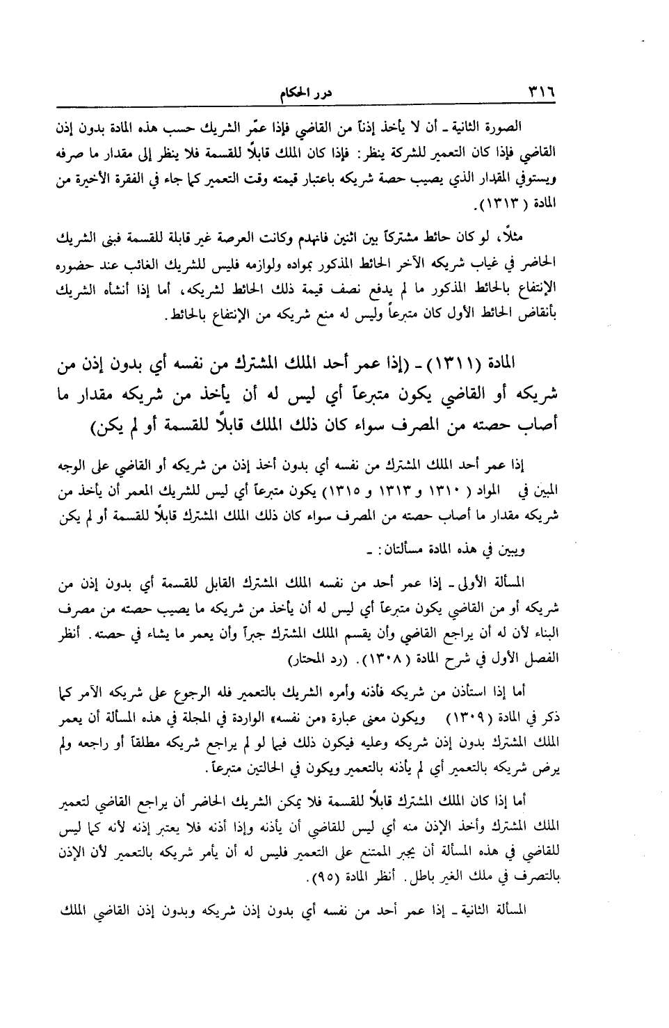الْمَادَّةُ (1311) - (إذَا عَمَّرَ أَحَدٌ الْمِلْكَ الْمُشْتَرَكَ مِنْ نَفْسِهِ أَيْ بِدُونِ إذْنٍ مِنْ شَرِيكِهِ أَوْ الْقَاضِي يَكُونُ مُتَبَرِّعًا أَيْ لَيْسَ لَهُ أَنْ يَأْخُذَ مِنْ شَرِيكِهِ مِقْدَارَ مَا أَصَابَ حِصَّتَهُ مِنْ الْمُصْرَفِ سَوَاءٌ كَانَ ذَلِكَ الْمِلْكُ قَابِلًا لِلْقِسْمَةِ أَوْ لَمْ يَكُنْ) إذَا عَمَّرَ أَحَدٌ الْمِلْكَ الْمُشْتَرَكَ مِنْ نَفْسِهِ أَيْ بِدُونِ أَخْذِ إذْنٍ مِنْ شَرِيكِهِ أَوْ الْقَاضِي عَلَى الْوَجْهِ الْمُبَيَّنِ فِي الْمَوَادِّ (1310 وَ 1313 وَ 1315) يَكُونُ مُتَبَرِّعًا أَيْ لَيْسَ لِلشَّرِيكِ الْمُعَمِّرِ أَنْ يَأْخُذَ مِنْ شَرِيكِهِ مِقْدَارَ مَا أَصَابَ حِصَّتَهُ مِنْ الْمُصْرَفِ سَوَاءٌ كَانَ ذَلِكَ الْمِلْكُ الْمُشْتَرَكُ قَابِلًا لِلْقِسْمَةِ أَوْ لَمْ يَكُنْ وَيُبَيَّنُ فِي هَذِهِ الْمَادَّةِ مَسْأَلَتَانِ: -