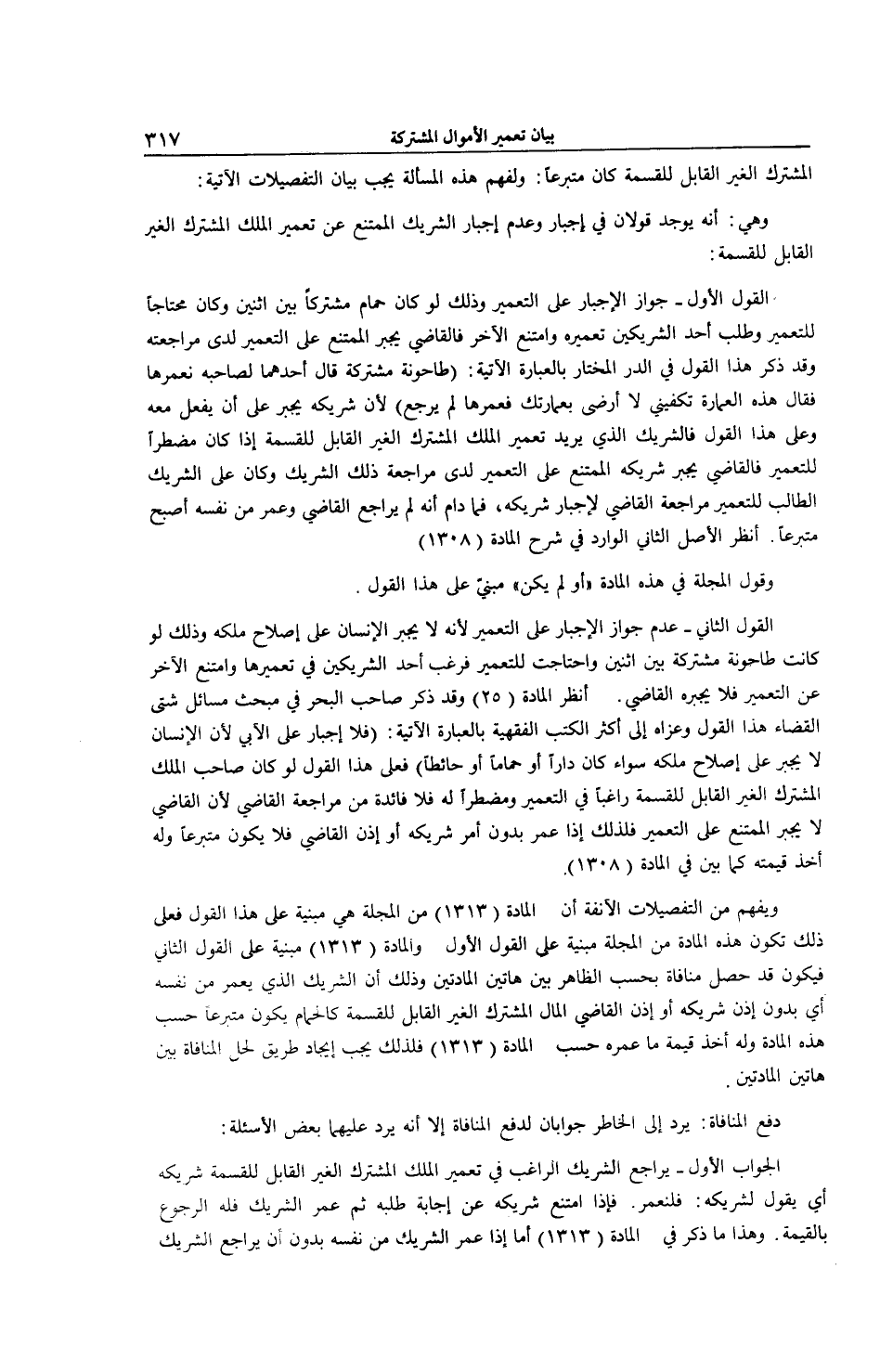 وَيُفْهَمُ مِنْ التَّفْصِيلَاتِ الْآنِفَةِ أَنَّ الْمَادَّةَ (1313) مِنْ الْمَجَلَّةِ هِيَ مَبْنِيَّةٌ عَلَى هَذَا الْقَوْلِ فَعَلَى ذَلِكَ تَكُونُ هَذِهِ الْمَادَّةُ مِنْ الْمَجَلَّةِ مَبْنِيَّةً عَلَى الْقَوْلِ الْأَوَّلِ وَالْمَادَّةُ (1313) مَبْنِيَّةٌ عَلَى الْقَوْلِ الثَّانِي فَيَكُونُ قَدْ حَصَلَ مُنَافَاةٌ بِحَسَبِ الظَّاهِرِ بَيْنَ هَاتَيْنِ الْمَادَّتَيْنِ وَذَلِكَ أَنَّ الشَّرِيكَ الَّذِي يُعَمِّرُ مِنْ نَفْسِهِ أَيْ بِدُونِ إذْنِ شَرِيكِهِ أَوْ إذْنِ الْقَاضِي الْمَالَ الْمُشْتَرَكَ الْغَيْرَ الْقَابِلِ لِلْقِسْمَةِ كَالْحَمَّامِ يَكُونُ مُتَبَرِّعًا حَسَبَ هَذِهِ الْمَادَّةِ وَلَهُ أَخْذُ قِيمَةِ مَا عَمَّرَهُ حَسَبَ الْمَادَّةِ (1313) فَلِذَلِكَ يَجِبُ إيجَادُ طَرِيقٍ لِحَلِّ الْمُنَافَاةِ بَيْنَ - هَاتَيْنِ الْمَادَّتَيْنِ.