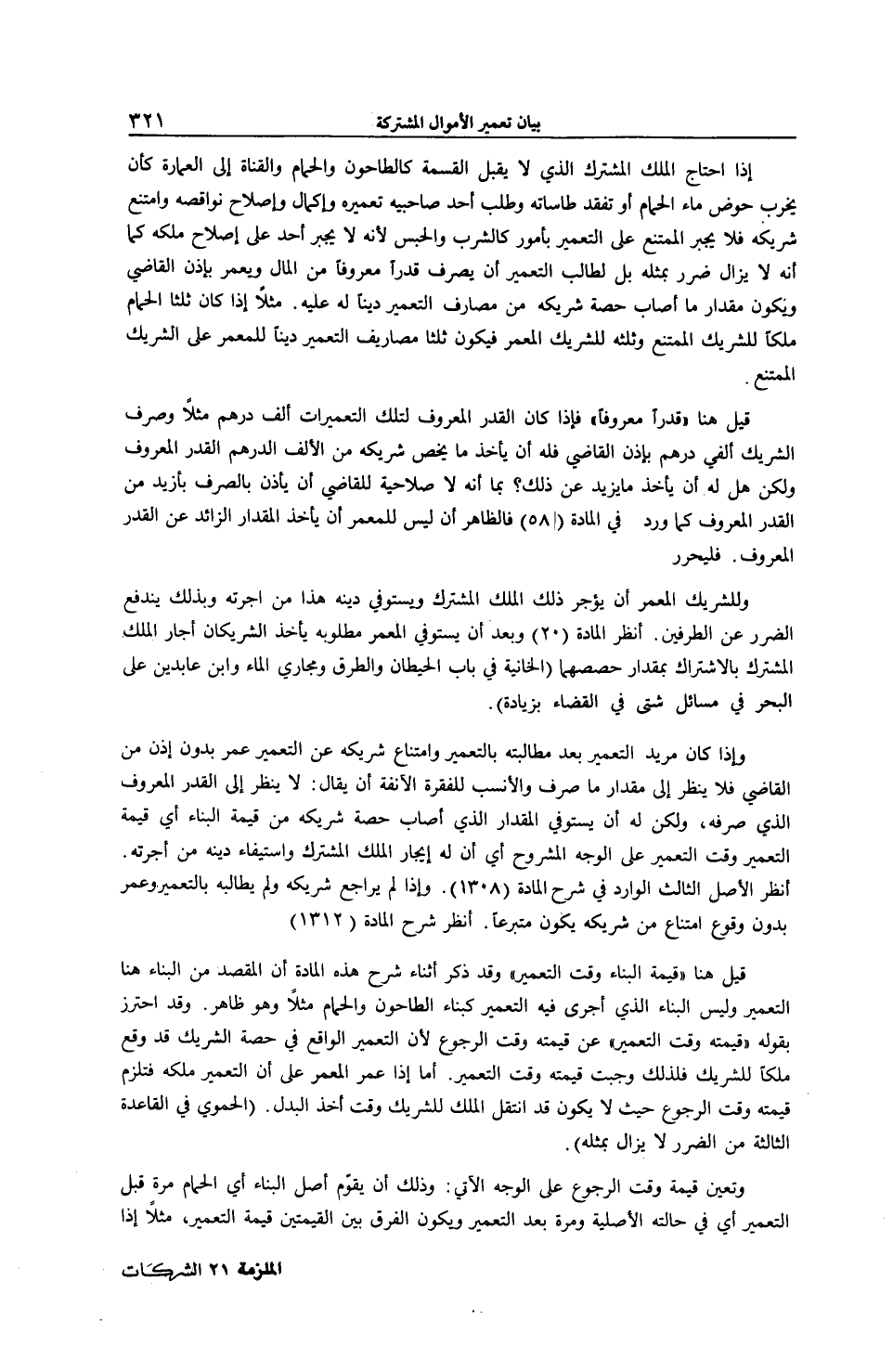 اُنْظُرْ الْمَادَّةَ (20) وَبَعْدَ أَنْ يَسْتَوْفِيَ الْمُعَمِّرُ مَطْلُوبَهُ يَأْخُذُ الشَّرِيكَانِ إجَارَ الْمِلْكِ الْمُشْتَرَكِ بِالِاشْتِرَاكِ بِمِقْدَارِ حِصَصِهِمَا (الْخَانِيَّةُ فِي بَابِ الْحِيطَانِ وَالطُّرُقِ وَمَجَارِي الْمَاءِ وَابْنُ عَابِدِينَ عَلَى الْبَحْرُ فِي مَسَائِلَ شَتَّى فِي الْقَضَاءِ بِزِيَادَةٍ) .