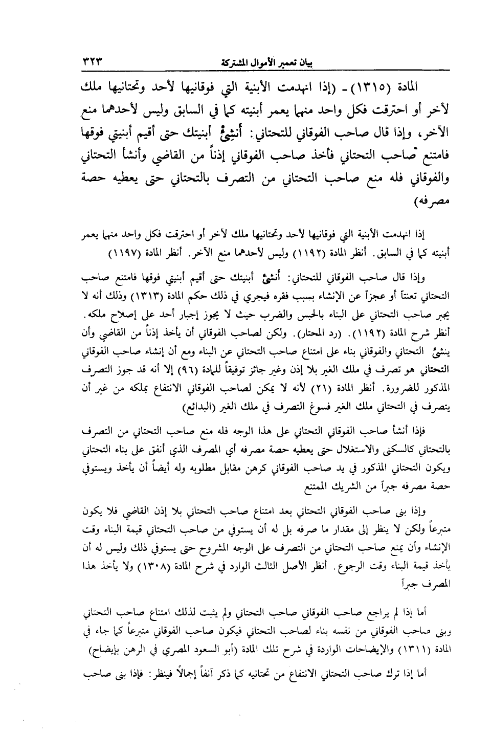 الْمَادَّةُ (1315) - (إذَا انْهَدَمَتْ الْأَبْنِيَةُ الَّتِي فَوْقَانِيُّهَا لِأَحَدٍ وَتَحْتَانِيُّهَا مِلْكٌ لِآخَرَ أَوْ احْتَرَقَتْ فَكُلُّ وَاحِدٍ مِنْهُمَا يُعَمِّرُ أَبْنِيَتَهُ كَمَا فِي السَّابِقِ وَلَيْسَ لِأَحَدِهِمَا مَنْعُ الْآخَرِ، وَإِذَا قَالَ صَاحِبُ الْفَوْقَانِيِّ لِلتَّحْتَانِيِّ: أَنْشِئْ أَبْنِيَتَكَ حَتَّى أُقِيمَ أَبْنِيَتِي فَوْقَهَا فَامْتَنَعَ صَاحِبُ التَّحْتَانِيِّ فَأَخَذَ صَاحِبُ الْفَوْقَانِيِّ إذْنًا مِنْ الْقَاضِي وَأَنْشَأَ التَّحْتَانِيَّ وَالْفَوْقَانِيَّ فَلَهُ مَنْعُ صَاحِبِ التَّحْتَانِيِّ مِنْ التَّصَرُّفِ بِالتَّحْتَانِيِّ حَتَّى يُعْطِيَهُ حِصَّةَ مُصْرَفِهِ) إذَا انْهَدَمَتْ الْأَبْنِيَةُ الَّتِي فَوْقَانِيُّهَا لِأَحَدٍ وَتَحْتَانِيُّهَا مِلْكٌ لِآخَرَ أَوْ احْتَرَقَتْ فَكُلُّ وَاحِدٍ مِنْهُمَا يُعَمِّرُ أَبْنِيَتَهُ كَمَا فِي السَّابِقِ. اُنْظُرْ الْمَادَّةَ (1192) وَلَيْسَ لِأَحَدِهِمَا مَنْعُ الْآخَرِ. اُنْظُرْ الْمَادَّةَ (1197)
