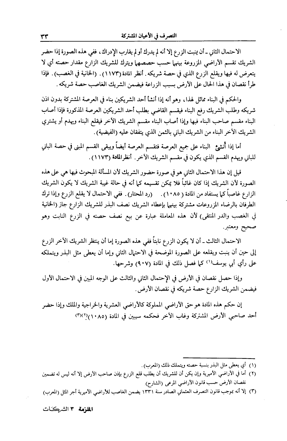 الِاحْتِمَالُ الثَّالِثُ - أَنْ لَا يَكُونَ الزَّرْعُ نَابِتًا فَفِي هَذِهِ الصُّورَةِ إمَّا أَنْ يَنْتَظِرَ الشَّرِيكُ الْآخَرُ الزَّرْعَ إلَى حِينِ أَنْ يَنْبُتَ وَيَقْلَعَهُ عَلَى الصُّورَةِ الْمُوَضَّحَةِ فِي الِاحْتِمَالِ وَإِمَّا أَنْ يُعْطِيَ مِثْلَ الْبَذْرِ وَيَتَمَلَّكَهُ عَلَى رَأْيِ أَبِي يُوسُفَ كَمَا فُصِّلَ ذَلِكَ فِي الْمَادَّةِ (907) وَشَرْحِهَا.