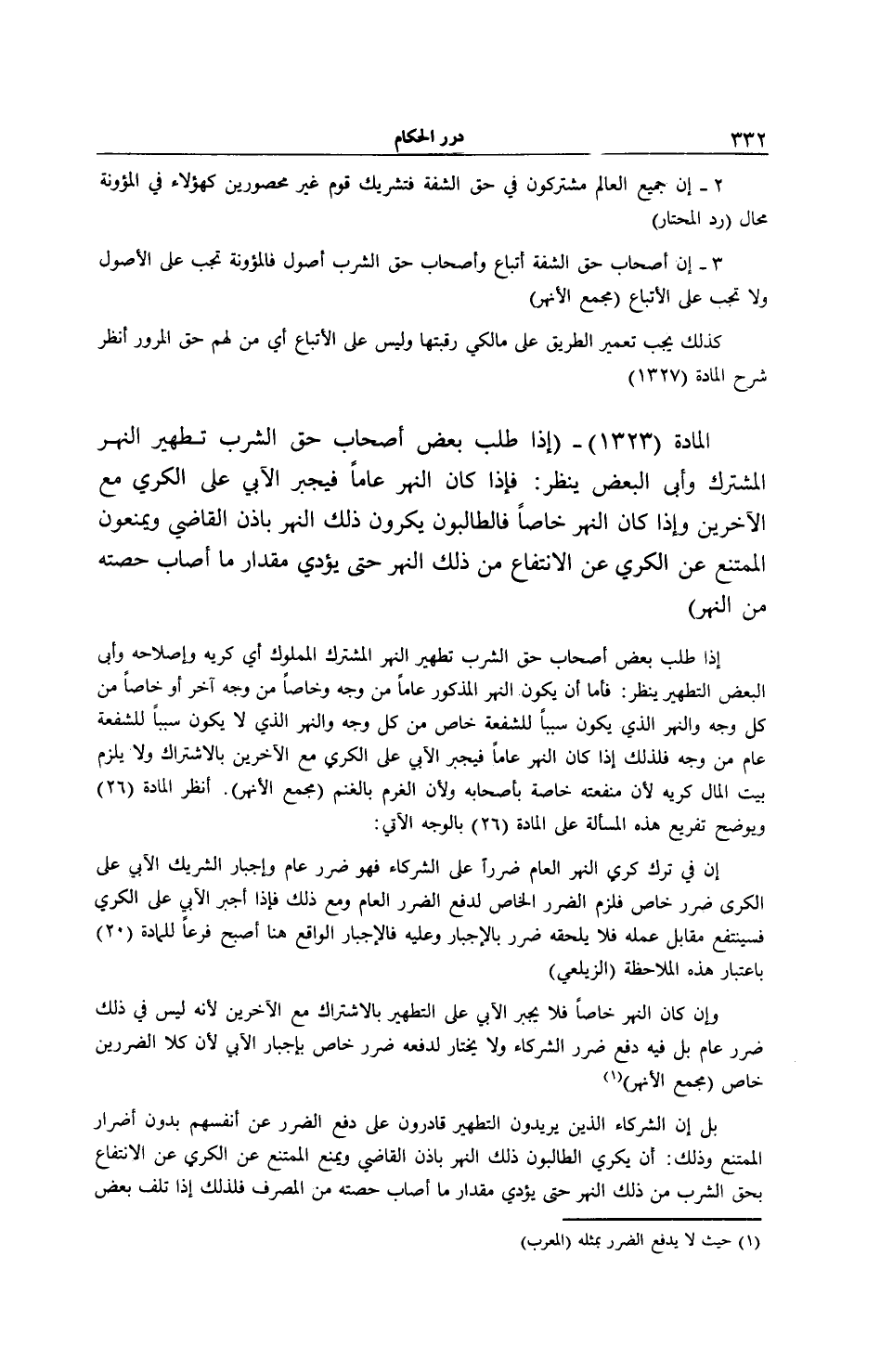الْمَادَّةُ (1323) - (إذَا طَلَبَ بَعْضُ أَصْحَابِ حَقِّ الشِّرْبِ تَطْهِيرَ النَّهْرِ الْمُشْتَرَكِ وَأَبَى الْبَعْضُ يُنْظَرُ: فَإِذَا كَانَ النَّهْرُ عَامًّا فَيُجْبَرُ الْآبِي عَلَى الْكَرْيِ مَعَ الْآخَرِينَ وَإِذَا كَانَ النَّهْرُ خَاصًّا فَالطَّالِبُونَ يَكْرُونَ ذَلِكَ النَّهْرَ بِإِذْنِ الْقَاضِي وَيَمْنَعُونَ الْمُمْتَنِعَ عَنْ الْكَرْيِ عَنْ الِانْتِفَاعِ مِنْ ذَلِكَ النَّهْرِ حَتَّى يُؤَدِّيَ مِقْدَارَ مَا أَصَابَ حِصَّتَهُ مِنْ النَّهْرِ)