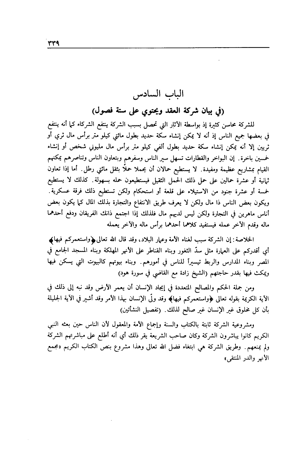 ٍ) لِلشَّرِكَةِ مَحَاسِنُ كَثِيرَةٌ إذْ بِوَاسِطَةِ الْآثَارِ الَّتِي تَحْصُلُ بِسَبَبِ الشَّرِكَةِ يَنْتَفِعُ الشُّرَكَاءُ كَمَا أَنَّهُ يَنْتَفِعُ فِي بَعْضِهَا جَمِيعُ النَّاسِ إذْ إنَّهُ لَا يُمْكِنُ إنْشَاءُ سِكَّةِ حَدِيدٍ بِطُولِ مِائَتَيْ كِيلُو مِتْرٍ بِرَأْسِ مَالِ ثَرِيٍّ أَوْ ثَرِيَّيْنِ إلَّا أَنَّهُ يُمْكِنُ إنْشَاءُ سِكَّةِ حَدِيدٍ بِطُولِ أَلْفَيْ كِيلُو مِتْرٍ بِرَأْسِ مَالِ مِلْيُونَيْ شَخْصٍ أَوْ إنْشَاءُ خَمْسِينَ بَاخِرَةً. إنَّ الْبَوَاخِرَ وَالْقِطَارَاتِ تُسَهِّلُ سَيْرَ النَّاسِ وَسَفَرَهُمْ وَبِتَعَاوُنِ النَّاسِ وَتَنَاصُرِهِمْ يُمْكِنُهُمْ الْقِيَامُ بِمَشَارِيعَ عَظِيمَةٍ وَمُفِيدَةٍ. لَا يَسْتَطِيعُ حَمَّالَانِ أَنْ يَحْمِلَا حِمْلًا بِثِقْلِ مِائَتَيْ رِطْلٍ. أَمَّا إذَا تَعَاوَنَ ثَمَانِيَةُ أَوْ عَشَرَةُ حَمَّالِينَ عَلَى حَمْلِ ذَلِكَ الْحِمْلِ الثَّقِيلِ فَيَسْتَطِيعُونَ حَمْلَهُ بِسُهُولَةٍ. كَذَلِكَ لَا يَسْتَطِيعُ خَمْسَةُ أَوْ عَشَرَةُ جُنُودٍ مِنْ الِاسْتِيلَاءِ عَلَى قَلْعَةٍ أَوْ اسْتِحْكَامٍ وَلَكِنْ تَسْتَطِيعُ ذَلِكَ فِرْقَةٌ عَسْكَرِيَّةٌ. وَيَكُونُ بَعْضُ النَّاسِ ذَا مَالٍ وَلَكِنْ لَا يَعْرِفُ طَرِيقَ الِانْتِفَاعِ وَالتِّجَارَةِ بِذَلِكَ الْمَالِ كَمَا يَكُونُ بَعْضُ أُنَاسٍ مَاهِرِينَ فِي التِّجَارَةِ وَلَكِنْ لَيْسَ لَدَيْهِمْ مَالٌ فَلِذَلِكَ إذَا اجْتَمَعَ ذَانِكَ الْفَرِيقَانِ وَدَفَعَ أَحَدُهُمَا مَالَهُ وَقَدَّمَ الْآخَرُ عَمَلَهُ فَيَسْتَفِيدُ كِلَاهُمَا أَحَدُهُمَا بِرَأْسِ مَالٍ وَالْآخَرُ بِعَمَلِهِ. الْخُلَاصَةُ: إنَّ الشَّرِكَةَ سَبَبٌ لِغَنَاءِ الْأُمَّةِ وَعَمَارِ الْبِلَادِ وَقَدْ قَالَ اللَّهُ تَعَالَى {وَاسْتَعْمَرَكُمْ فِيهَا} [هود: 61] أَيْ أَقْدَرَكُمْ عَلَى الْعِمَارَةِ مِثْلُ سَدِّ الثُّغُورِ وَبِنَاءِ الْقَنَاطِرِ عَلَى الْأَنْهُرِ الْمُهْلِكَةِ وَبِنَاءِ الْمَسْجِدِ الْجَامِعِ فِي الْمِصْرِ وَبِنَاءِ الْمَدَارِسِ وَالرُّبُطِ تَيْسِيرًا لِلنَّاسِ فِي أُمُورِهِمْ. وَبِنَاءِ بُيُوتِهِمْ كَالْبُيُوتِ الَّتِي يُسْكَنُ فِيهَا وَيُمْكَثُ فِيهَا بِقَدْرِ حَاجَتِهِمْ (الشَّيْخُ زَادَهْ مَعَ الْقَاضِي فِي سُورَةِ هُودٍ) وَمِنْ جُمْلَةِ الْحِكَمِ وَالْمَصَالِحِ الْمُتَعَدِّدَةِ فِي إيجَادِ الْإِنْسَانِ أَنْ يُعَمِّرَ الْأَرْضَ وَقَدْ نَبَّهَ إلَى ذَلِكَ فِي الْآيَةِ الْكَرِيمَةِ بِقَوْلِهِ تَعَالَى {وَاسْتَعْمَرَكُمْ فِيهَا} [هود: 61] وَقَدْ وُلِّيَ الْإِنْسَانُ بِهَذَا الْأَمْرِ وَقَدْ أُشِيرَ فِي الْآيَةِ الْجَلِيلَةِ بِأَنَّ كُلَّ مَخْلُوقٍ غَيْرِ الْإِنْسَانِ غَيْرُ صَالِحٍ لِذَلِكَ (تَفْصِيلُ النَّشْأَتَيْنِ) وَمَشْرُوعِيَّةُ الشَّرِكَةِ ثَابِتَةٌ بِالْكِتَابِ وَالسُّنَّةِ وَإِجْمَاعِ الْأُمَّةِ وَالْمَعْقُولِ لِأَنَّ النَّاسَ حِينَ بَعْثَةِ النَّبِيِّ الْكَرِيمِ كَانُوا يُبَاشِرُونَ الشَّرِكَةَ وَكَانَ صَاحِبُ الشَّرِيعَةِ يُقِرُّ ذَلِكَ أَيْ أَنَّهُ اطَّلَعَ عَلَى مُبَاشَرَتِهِمْ الشَّرِكَةَ وَلَمْ يَمْنَعْهُمْ.
