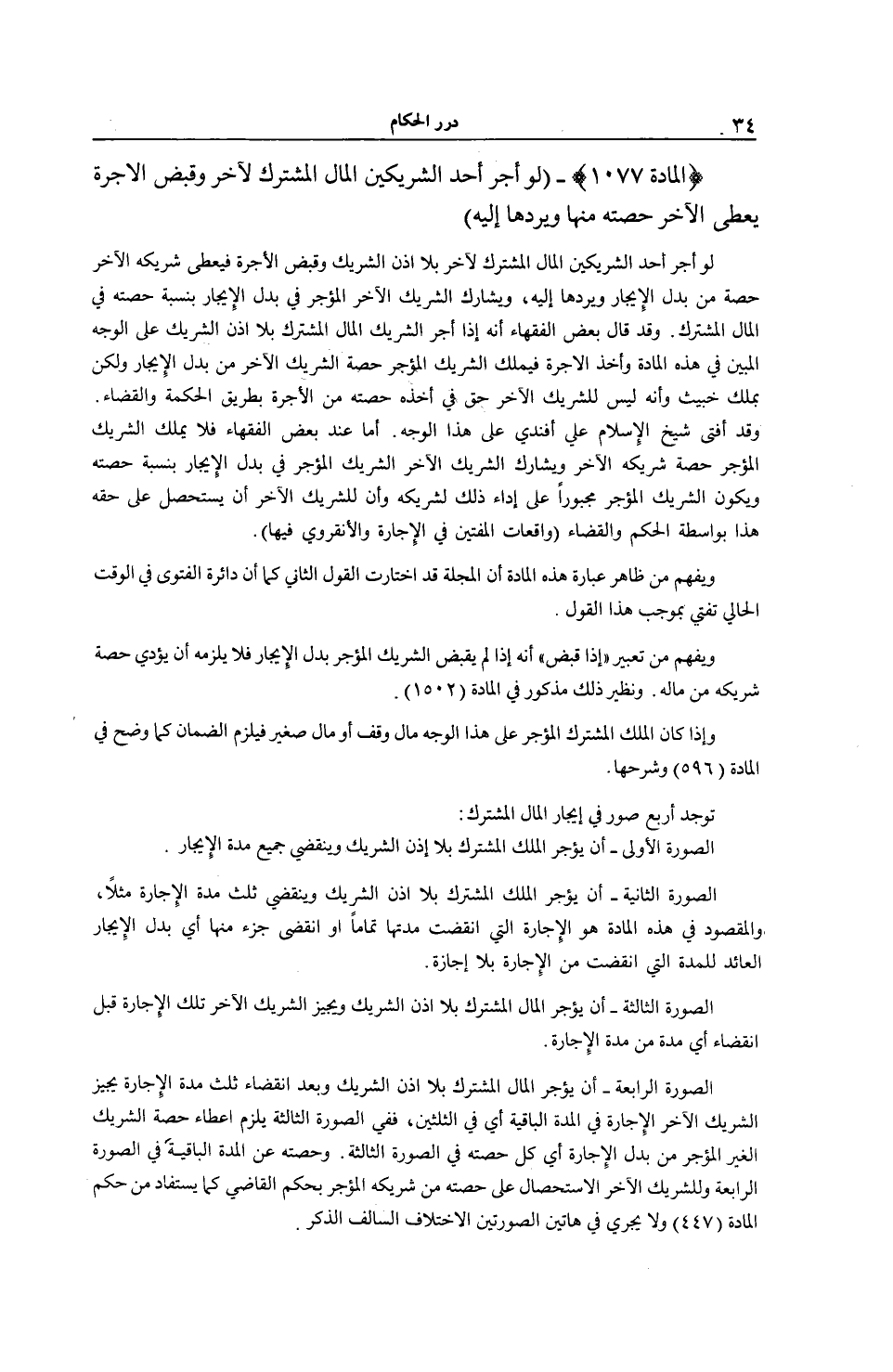 لَوْ أَجَّرَ أَحَدُ الشَّرِيكَيْنِ الْمَالَ الْمُشْتَرَكَ لِآخَرَ بِلَا إذْنِ الشَّرِيكِ وَقَبَضَ الْأُجْرَةَ فَيُعْطَى شَرِيكَهُ الْآخَرَ حِصَّةً مِنْ بَدَلِ الْإِيجَارِ وَيَرُدُّهَا إلَيْهِ، وَيُشَارِكُ الشَّرِيكَ الْآخَرَ الْمُؤَجِّرَ فِي بَدَلِ الْإِيجَارِ بِنِسْبَةِ حِصَّتِهِ فِي الْمَالِ الْمُشْتَرَكِ. وَقَدْ قَالَ بَعْضُ الْفُقَهَاءِ: إنَّهُ إذَا أَجَّرَ الشَّرِيكُ الْمَالَ الْمُشْتَرَكَ بِلَا إذْنِ الشَّرِيكِ عَلَى الْوَجْهِ الْمُبَيَّنِ فِي هَذِهِ الْمَادَّةِ وَأَخَذَ الْأُجْرَةَ فَيَمْلِكُ الشَّرِيكُ الْمُؤَجِّرُ حِصَّةَ الشَّرِيكِ الْآخَرِ مِنْ بَدَلِ الْإِيجَارِ وَلَكِنْ بِمِلْكٍ خَبِيثٍ وَإِنَّهُ لَيْسَ لِلشَّرِيكِ الْآخَرِ حَقٌّ فِي أَخْذِهِ حِصَّتَهُ مِنْ الْأُجْرَةِ بِطَرِيقِ الْحُكْمِ وَالْقَضَاءِ. وَقَدْ أَفْتَى شَيْخُ الْإِسْلَامِ عَلِيٌّ أَفَنْدِي عَلَى هَذَا الْوَجْهِ. أَمَّا عِنْدَ بَعْضِ الْفُقَهَاءِ فَلَا يَمْلِكُ الشَّرِيكُ الْمُؤَجِّرُ حِصَّةَ شَرِيكِهِ الْآخَرِ وَيُشَارِكُ الشَّرِيكُ الْآخَرُ الشَّرِيكَ الْمُؤَجِّرَ فِي بَدَلِ الْإِيجَارِ بِنِسْبَةِ حِصَّتِهِ وَيَكُونُ الشَّرِيكُ الْمُؤَجِّرُ مَجْبُورًا عَلَى أَدَاءِ ذَلِكَ لِشَرِيكِهِ وَأَنَّ لِلشَّرِيكِ الْآخَرِ أَنْ يَسْتَحْصِلَ عَلَى حَقِّهِ هَذَا بِوَاسِطَةِ الْحُكْمِ وَالْقَضَاءِ (وَاقِعَاتُ الْمُفْتِينَ فِي الْإِجَارَةِ وَالنَّقْرَوِيِّ فِيهَا) .
