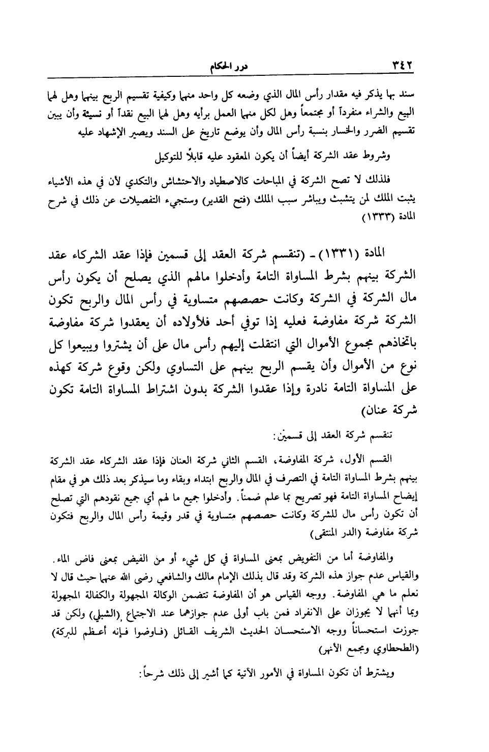الْمَادَّةُ (1331) - (تَنْقَسِمُ شَرِكَةُ الْعَقْدِ إلَى قِسْمَيْنِ فَإِذَا عَقَدَ الشُّرَكَاءُ عَقْدَ الشَّرِكَةِ بَيْنَهُمْ بِشَرْطِ الْمُسَاوَاةِ التَّامَّةِ وَأَدْخَلُوا مَالَهُمْ الَّذِي يَصْلُحُ أَنْ يَكُونَ رَأْسَ مَالِ الشَّرِكَةِ فِي الشَّرِكَةِ وَكَانَتْ حِصَصُهُمْ مُتَسَاوِيَةً فِي رَأْسِ الْمَالِ وَالرِّبْحِ تَكُونُ الشَّرِكَةُ شَرِكَةَ مُفَاوَضَةٍ فَعَلَيْهِ إذَا تُوُفِّيَ أَحَدٌ فَلِأَوْلَادِهِ أَنْ يَعْقِدُوا شَرِكَةَ مُفَاوَضَةٍ بِاِتِّخَاذِهِمْ مَجْمُوعَ الْأَمْوَالِ الَّتِي انْتَقَلَتْ إلَيْهِمْ رَأْسَ مَالٍ عَلَى أَنْ يَشْتَرُوا وَيَبِيعُوا كُلَّ نَوْعٍ مِنْ الْأَمْوَالِ وَأَنْ يُقْسَمَ الرِّبْحُ بَيْنَهُمْ عَلَى التَّسَاوِي وَلَكِنْ وُقُوعُ شَرِكَةٍ كَهَذِهِ عَلَى الْمُسَاوَاةِ التَّامَّةِ نَادِرَةٌ وَإِذَا عَقَدُوا الشَّرِكَةَ بِدُونِ اشْتِرَاطِ الْمُسَاوَاةِ التَّامَّةِ تَكُونُ شَرِكَةَ عِنَانٍ) .