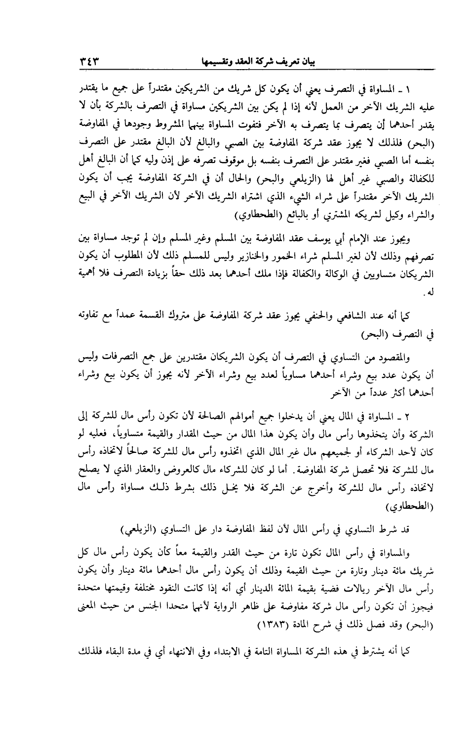 1 - الْمُسَاوَاةُ فِي التَّصَرُّفِ يَعْنِي أَنْ يَكُونَ كُلُّ شَرِيكٍ مِنْ الشَّرِيكَيْنِ مُقْتَدِرًا عَلَى جَمِيعِ مَا يَقْتَدِرُ عَلَيْهِ الشَّرِيكُ الْآخَرُ مِنْ الْعَمَلِ لِأَنَّهُ إذَا لَمْ يَكُنْ بَيْنَ الشَّرِيكَيْنِ مُسَاوَاةٌ فِي التَّصَرُّفِ بِالشَّرِكَةِ بِأَنْ لَا يَقْدِرَ أَحَدُهُمَا أَنْ يَتَصَرَّفَ بِمَا يَتَصَرَّفُ بِهِ الْآخَرُ فَتَفُوتَ الْمُسَاوَاةُ بَيْنهمَا الْمَشْرُوطُ وُجُودُهَا فِي الْمُفَاوَضَةِ (الْبَحْرُ) فَلِذَلِكَ لَا يَجُوزُ عَقْدُ شَرِكَةِ الْمُفَاوَضَةِ بَيْنَ الصَّبِيِّ وَالْبَالِغِ لِأَنَّ الْبَالِغَ مُقْتَدِرٌ عَلَى التَّصَرُّفِ بِنَفْسِهِ أَمَّا الصَّبِيُّ فَغَيْرُ مُقْتَدِرٍ عَلَى التَّصَرُّفِ بِنَفْسِهِ بَلْ مَوْقُوفٌ تَصَرُّفُهُ عَلَى إذْنِ وَلِيِّهِ كَمَا أَنَّ الْبَالِغَ أَهْلٌ لِلْكَفَالَةِ وَالصَّبِيَّ غَيْرُ أَهْلٍ لَهَا (الزَّيْلَعِيّ وَالْبَحْرُ) .