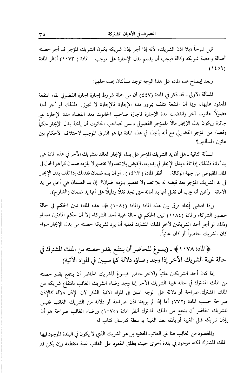 [ (الْمَادَّةُ 1078) يسوغ لِلْحَاضِرِ أَنْ يَنْتَفِع بِقَدْرِ حِصَّته مِنْ الْملك الْمُشْتَرَك فِي حَالَة غيبَة الشَّرِيك الْآخِر]