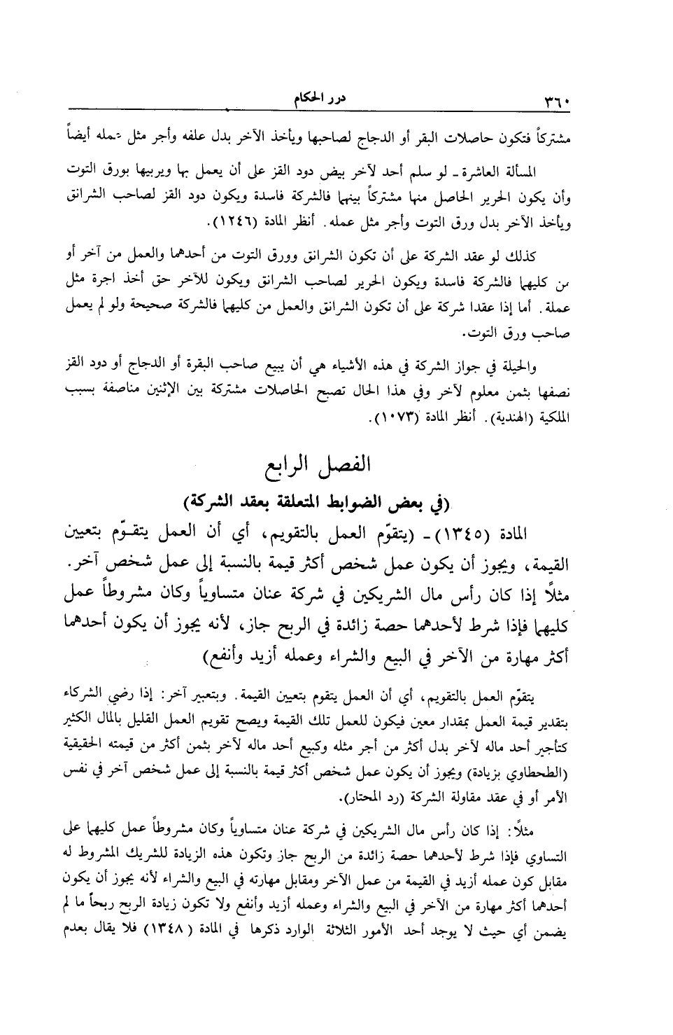 الْفَصْلُ الرَّابِعُ (فِي بَعْضِ الضَّوَابِطِ الْمُتَعَلِّقَةِ بِعَقْدِ الشَّرِكَةِ) الْمَادَّةُ (1345) - (يَتَقَوَّمُ الْعَمَلُ بِالتَّقْوِيمِ، أَيْ أَنَّ الْعَمَلَ يَتَقَوَّمُ بِتَعْيِينِ الْقِيمَةِ، وَيَجُوزُ أَنْ يَكُونَ عَمَلُ شَخْصٍ أَكْثَرَ قِيمَةً بِالنِّسْبَةِ إلَى عَمَلِ شَخْصٍ آخَرَ. مَثَلًا إذَا كَانَ رَأْسُ مَالِ الشَّرِيكَيْنِ فِي شَرِكَةِ عِنَانٍ مُتَسَاوِيًا وَكَانَ مَشْرُوطًا عَمَلُ كِلَيْهِمَا فَإِذَا شُرِطَ لِأَحَدِهِمَا حِصَّةٌ زَائِدَةً فِي الرِّبْحِ جَازَ، لِأَنَّهُ يَجُوزُ أَنْ يَكُونَ أَحَدُهُمَا أَكْثَرَ مَهَارَةً مِنْ الْآخَرِ فِي الْبَيْعِ وَالشِّرَاءِ وَعَمَلُهُ أَزْيَدَ وَأَنْفَعَ)