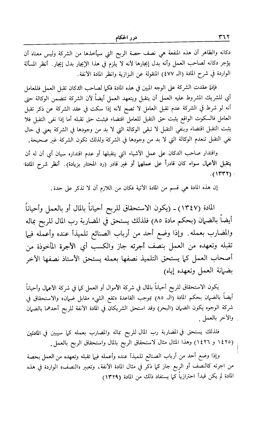 الْمَادَّةُ (1347) - (يَكُونُ الِاسْتِحْقَاقُ لِلرِّبْحِ أَحْيَانًا بِالْمَالِ أَوْ بِالْعَمَلِ وَأَحْيَانًا أَيْضًا بِالضَّمَانِ (بِحُكْمِ مَادَّةِ 85) فَلِذَلِكَ يَسْتَحِقُّ فِي الْمُضَارَبَةِ رَبُّ الْمَالِ لِلرِّبْحِ بِمَالِهِ وَالْمُضَارِبُ بِعَمَلِهِ. وَإِذَا وَضَعَ أَحَدٌ مِنْ أَرْبَابِ الصَّنَائِعِ تِلْمِيذًا عِنْدَهُ وَأَعْمَلَهُ فِيمَا تَقَبَّلَهُ وَتَعَهَّدَهُ مِنْ الْعَمَلِ بِنِصْفِ أُجْرَتِهِ جَازَ وَالْكَسْبُ أَيْ الْأُجْرَةُ الْمَأْخُوذَةُ مِنْ أَصْحَابِ الْعَمَلِ كَمَا يَسْتَحِقُّ التِّلْمِيذُ نِصْفَهَا بِعَمَلِهِ يَسْتَحِقُّ الْأُسْتَاذُ نِصْفَهَا الْآخَرَ بِضَمَانِهِ الْعَمَلَ وَتَعَهُّدِهِ إيَّاهُ) يَكُونُ الِاسْتِحْقَاقُ لِلرِّبْحِ أَحْيَانًا بِالْمَالِ فِي شَرِكَةِ الْأَمْوَالِ أَوْ الْعَمَلِ كَمَا فِي شَرِكَةِ الْأَعْمَالِ وَأَحْيَانًا أَيْضًا بِالضَّمَانِ بِحُكْمِ الْمَادَّةِ (الـ 85) بِمُوجِبِ الْقَاعِدَةِ " نَفْعُ الشَّيْءِ مُقَابِلُ ضَمَانٍ، وَالِاسْتِحْقَاقُ فِي شَرِكَةِ الْوُجُوهِ يَكُونُ بِالضَّمَانِ (الْبَحْرُ) وَقَدْ اسْتَحَقَّ الشَّرِيكَانِ فِي الْمَادَّةِ الْآنِفَةِ لِلرِّبْحِ أَحَدُهُمَا بِالضَّمَانِ وَالْآخَرُ بِالْعَمَلِ.