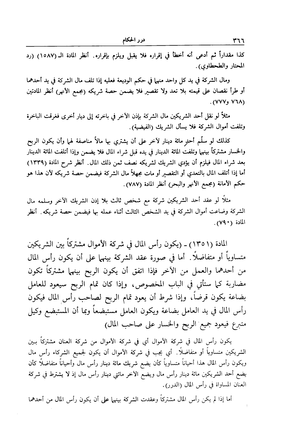 الْمَادَّةُ (1351) - (يَكُونُ رَأْسُ الْمَالِ فِي شَرِكَةِ الْأَمْوَالِ مُشْتَرَكًا بَيْنَ الشَّرِيكَيْنِ مُتَسَاوِيًا أَوْ مُتَفَاضِلًا. أَمَّا فِي صُورَةِ عَقْدِ الشَّرِكَةِ بَيْنَهُمَا عَلَى أَنْ يَكُونَ رَأْسُ الْمَالِ مِنْ أَحَدِهِمَا وَالْعَمَلُ مِنْ الْآخَرِ فَإِذَا اُتُّفِقَ أَنْ يَكُونَ الرِّبْحُ بَيْنَهُمَا مُشْتَرَكًا تَكُونُ مُضَارَبَةً كَمَا سَتَأْتِي فِي الْبَابِ الْمَخْصُوصِ، وَإِذَا كَانَ تَمَامُ الرِّبْحِ سَيَعُودُ لِلْعَامِلِ بِضَاعَةً يَكُونُ قَرْضًا، وَإِذَا شُرِطَ أَنْ يَعُودَ تَمَامُ الرِّبْحِ لِصَاحِبِ رَأْسِ الْمَالِ فَيَكُونَ رَأْسَيْ الْمَالِ فِي يَدِ الْعَامِلِ بِضَاعَةً وَيَكُونَ الْعَامِلُ مُسْتَبْضِعًا وَبِمَا أَنَّ الْمُسْتَبْضِعَ وَكِيلٌ مُتَبَرِّعٌ فَيَعُودُ جَمِيعُ الرِّبْحِ وَالْخَسَارِ عَلَى صَاحِبِ الْمَالِ)