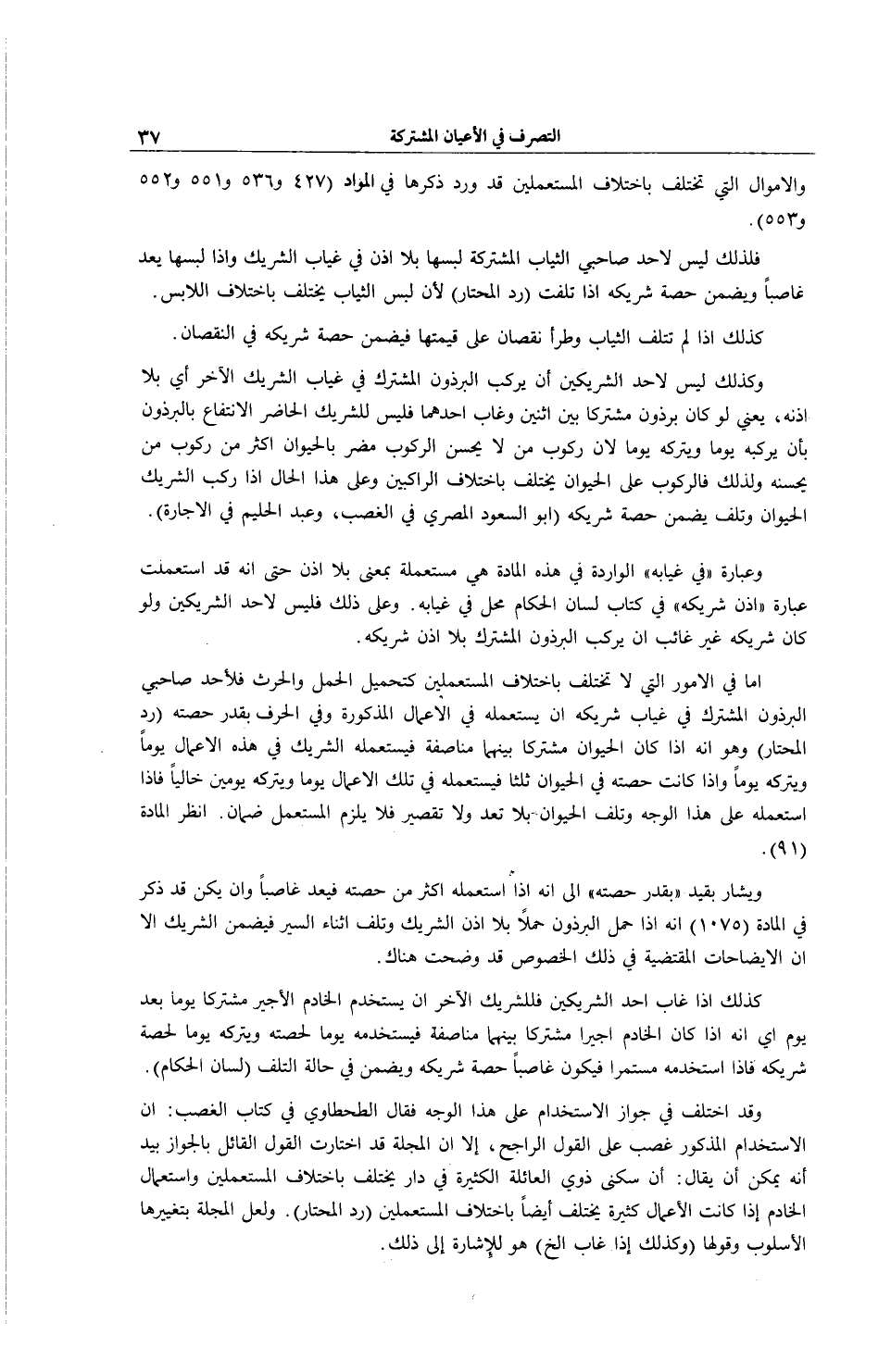 وَكَذَلِكَ لَيْسَ لِأَحَدِ الشَّرِيكَيْنِ أَنْ يَرْكَبَ الْبِرْذَوْنَ الْمُشْتَرَكَ فِي غِيَابِ الشَّرِيكِ الْآخَرِ أَيْ بِلَا إذْنِهِ، يَعْنِي لَوْ كَانَ بِرْذَوْنٌ مُشْتَرَكًا بَيْنَ اثْنَيْنِ وَغَابَ أَحَدُهُمَا فَلَيْسَ لِلشَّرِيكِ الْحَاضِرِ الِانْتِفَاعُ بِالْبِرْذَوْنِ بِأَنْ يَرْكَبَهُ يَوْمًا وَيَتْرُكَهُ يَوْمًا لِأَنَّ رَكُوبَ مَنْ لَا يُحْسِنُ الرُّكُوبَ مُضِرٌّ بِالْحَيَوَانِ أَكْثَرَ مِنْ رَكُوبِ مَنْ يُحْسِنُهُ وَلِذَلِكَ فَالرُّكُوبُ عَلَى الْحَيَوَانِ يَخْتَلِفُ بِاخْتِلَافِ الرَّاكِبِينَ وَعَلَى هَذَا الْحَالِ إذَا رَكِبَ الشَّرِيكُ الْحَيَوَانَ وَتَلِفَ يَضْمَنُ حِصَّةَ شَرِيكِهِ (أَبُو السُّعُودِ الْمِصْرِيُّ فِي الْغَصْبِ، وَعَبْدُ الْحَلِيمِ فِي الْإِجَارَةِ) . وَعِبَارَةُ (فِي غِيَابِهِ) الْوَارِدَةُ فِي هَذِهِ الْمَادَّةِ هِيَ مُسْتَعْمَلَةٌ بِمَعْنَى بِلَا إذْنٍ حَتَّى أَنَّهُ قَدْ اُسْتُعْمِلَتْ عِبَارَةُ (إذْنِ شَرِيكِهِ) فِي كِتَابِ لِسَانُ الْحُكَّامِ مَحَلٌّ فِي غِيَابِهِ. وَعَلَى ذَلِكَ فَلَيْسَ لِأَحَدِ الشَّرِيكَيْنِ - وَلَوْ كَانَ شَرِيكُهُ غَيْرَ غَائِبٍ - أَنْ يَرْكَبَ الْبِرْذَوْنَ الْمُشْتَرَكَ بِلَا إذْنِ شَرِيكِهِ. أَمَّا فِي الْأُمُورِ الَّتِي لَا تَخْتَلِفُ بِاخْتِلَافِ الْمُسْتَعْمِلِينَ كَتَحْمِيلِ الْحَمْلِ وَالْحَرْثِ فَلِأَحَدِ صَاحِبَيْ الْبِرْذَوْنِ الْمُشْتَرَكِ فِي غِيَابِ شَرِيكِهِ أَنْ يَسْتَعْمِلَهُ فِي الْأَعْمَالِ الْمَذْكُورَةِ وَفِي الْحِرَفِ بِقَدْرِ حِصَّتِهِ (رَدُّ الْمُحْتَارِ) وَهُوَ أَنَّهُ إذَا كَانَ الْحَيَوَانُ مُشْتَرَكًا بَيْنَهُمَا مُنَاصَفَةً فَيَسْتَعْمِلُهُ الشَّرِيكُ فِي هَذِهِ الْأَعْمَالِ يَوْمًا وَيَتْرُكُهُ يَوْمًا وَإِذَا كَانَتْ حِصَّتُهُ فِي الْحَيَوَانِ ثُلُثًا فَيَسْتَعْمِلُهُ فِي تِلْكَ الْأَعْمَالِ يَوْمًا وَيَتْرُكُهُ يَوْمَيْنِ خَالِيًا فَإِذَا اسْتَعْمَلَهُ عَلَى هَذَا الْوَجْهِ وَتَلِفَ الْحَيَوَانُ بِلَا تَعَدٍّ وَلَا تَقْصِيرٍ فَلَا يَلْزَمُ الْمُسْتَعْمِلَ ضَمَانٌ. اُنْظُرْ الْمَادَّةَ (1 9) .