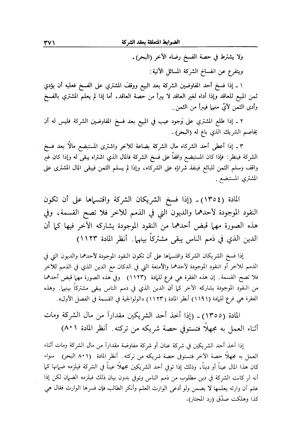 وَيَتَفَرَّعُ عَنْ انْفِسَاخِ الشَّرِكَةِ الْمَسَائِلُ الْآتِيَةُ: