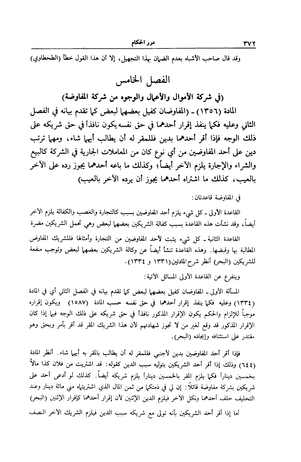 الْمَادَّةُ (1356) - (الْمُفَاوِضَانِ كَفِيلٌ بَعْضُهُمَا لِبَعْضٍ كَمَا تَقَدَّمَ بَيَانُهُ فِي الْفَصْلِ الثَّانِي وَعَلَيْهِ فَكَمَا يَنْفُذُ إقْرَارُ أَحَدِهِمَا فِي حَقِّ نَفْسِهِ يَكُونُ نَافِذًا فِي حَقِّ شَرِيكِهِ عَلَى ذَلِكَ الْوَجْهِ فَإِذَا أَقَرَّ أَحَدُهُمَا بِدَيْنٍ فَلِلْمُقَرِّ لَهُ أَنْ يُطَالِبَ أَيَّهُمَا شَاءَ، وَمَهْمَا تَرَتَّبَ دَيْنٌ عَلَى أَحَدِ الْمُفَاوِضَيْنِ مِنْ أَيِّ نَوْعٍ كَانَ مِنْ الْمُعَامَلَاتِ الْجَارِيَةِ فِي الشَّرِكَةِ كَالْبَيْعِ وَالشِّرَاءِ وَالْإِجَارَةِ يَلْزَمُ الْآخَرَ أَيْضًا؛ وَكَذَلِكَ مَا بَاعَهُ أَحَدُهُمَا يَجُوزُ رَدُّهُ عَلَى الْآخَرِ بِالْعَيْبِ، كَذَلِكَ مَا اشْتَرَاهُ أَحَدُهُمَا يَجُوزُ أَنْ يَرُدَّهُ الْآخَرُ بِالْعَيْبِ)