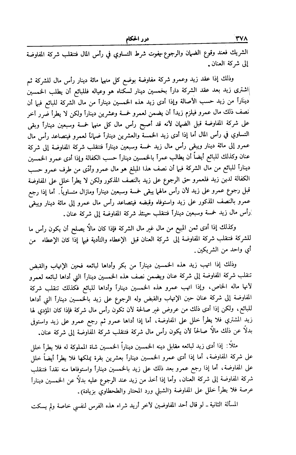 الشَّرِكَةِ فَعِنْدَ وُقُوعِ الضَّمَانِ وَالرُّجُوعِ يَفُوتُ شَرْطُ التَّسَاوِي فِي رَأْسِ الْمَالِ فَتَنْقَلِبُ شَرِكَةُ الْمُفَاوَضَةِ إلَى شَرِكَةِ الْعِنَانِ. وَذَلِكَ إذَا عَقَدَ زَيْدٌ وَعَمْرٌو شَرِكَةَ مُفَاوَضَةٍ بِوَضْعِ كُلٍّ مِنْهُمَا مِائَةَ دِينَارٍ رَأْسَ مَالِ لِلشَّرِكَةِ ثُمَّ اشْتَرَى زَيْدٌ بَعْدَ عَقْدِ الشَّرِكَةِ دَارًا بِخَمْسِينَ دِينَارٍ لِسُكْنَاهُ هُوَ وَعِيَالَهُ فَلِلْبَائِعِ أَنْ يَطْلُبَ الْخَمْسِينَ دِينَارًا مِنْ زَيْدٍ حَسَبَ الْأَصَالَةِ وَإِذَا أَدَّى زَيْدٌ هَذِهِ الْخَمْسِينَ دِينَارًا مِنْ مَالِ الشَّرِكَةِ لِلْبَائِعِ فَبِمَا أَنَّ نِصْفَ ذَلِكَ مَالُ عَمْرٍو فَيَلْزَمُ زَيْدًا أَنْ يَضْمَنَ لِعَمْرٍو خَمْسَةً وَعِشْرِينَ دِينَارًا وَلَكِنْ لَا يَطْرَأُ ضَرَرٌ آخَرُ عَلَى شَرِكَةِ الْمُفَاوَضَةِ قَبْلَ الضَّمَانِ لِأَنَّهُ قَدْ أَصْبَحَ رَأْسُ مَالِ كُلٍّ مِنْهُمَا خَمْسَةً وَسَبْعِينَ دِينَارًا وَبَقِيَ التَّسَاوِي فِي رَأْسِ الْمَالِ أَمَّا إذَا أَدَّى زَيْدٌ الْخَمْسَةَ وَالْعِشْرِينَ دِينَارًا ضَمَانًا لِعَمْرٍو فَيَتَصَاعَدُ رَأْسُ مَالِ عَمْرٍو إلَى مِائَةِ دِينَارٍ وَيَبْقَى رَأْسُ مَالِ زَيْدٍ خَمْسَةً وَسَبْعِينَ دِينَارًا فَتَنْقَلِبُ شَرِكَةُ الْمُفَاوَضَةِ إلَى شَرِكَةِ عِنَانٍ وَكَذَلِكَ لِلْبَائِعِ أَيْضًا أَنْ يُطَالِبَ عَمْرًا بِالْخَمْسِينَ دِينَارًا حَسَبَ الْكَفَالَةِ وَإِذَا أَدَّى عَمْرٌو الْخَمْسِينَ دِينَارًا لِلْبَائِعِ مِنْ مَالِ الشَّرِكَةِ فَبِمَا أَنَّ نِصْفَ هَذَا الْمَبْلَغِ هُوَ مَالُ عَمْرٍو وَأَدَّى مِنْ طَرَفِ عَمْرٍو حَسَبَ الْكَفَالَةِ لِدَيْنِ زَيْدٍ فَلِعَمْرٍو حَقُّ الرُّجُوعِ عَلَى زَيْدٍ بِالنِّصْفِ الْمَذْكُورِ وَلَكِنْ لَا يَطْرَأُ خَلَلٌ عَلَى الْمُفَاوَضَةِ قَبْلَ رُجُوعِ عَمْرٍو عَلَى زَيْدٍ لِأَنَّ رَأْسَ مَالِهِمَا يَبْقَى خَمْسَةً وَسَبْعِينَ دِينَارًا وَمَازَالَ مُتَسَاوِيًا.