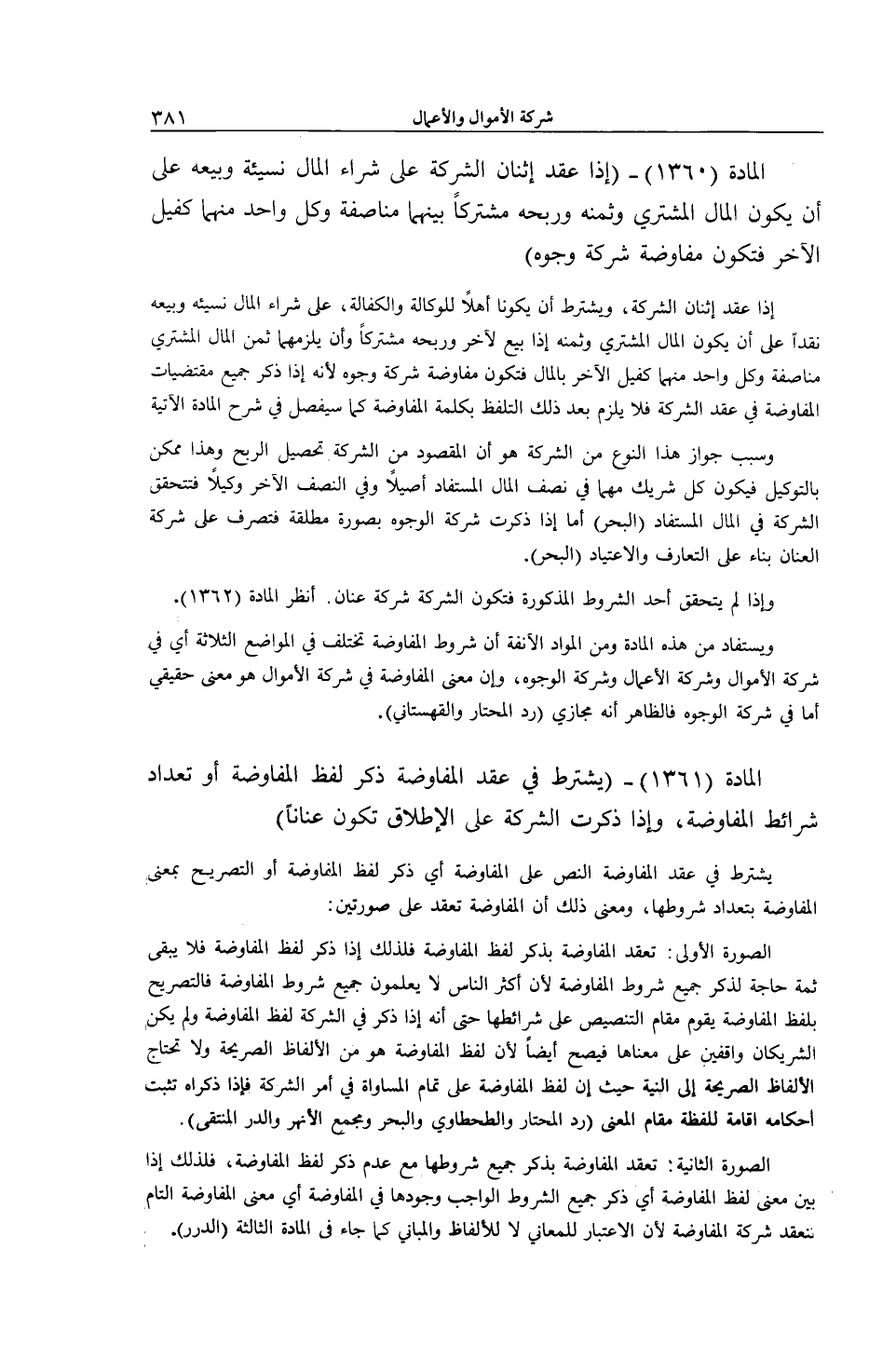 إذَا عَقَدَ اثْنَانِ الشَّرِكَةَ، وَيُشْتَرَطُ أَنْ يَكُونَا أَهْلًا لِلْوَكَالَةِ وَالْكَفَالَةِ عَلَى شِرَاءِ الْمَالِ نَسِيئَةً وَبَيْعِهِ نَقْدًا عَلَى أَنْ يَكُونَ الْمَالُ الْمُشْتَرَى وَثَمَنُهُ إذَا بِيعَ لِآخَرَ وَرِبْحُهُ مُشْتَرَكًا وَأَنْ يَلْزَمَهُمَا ثَمَنُ الْمَالِ الْمُشْتَرَى مُنَاصَفَةً وَكُلُّ وَاحِدٍ مِنْهُمَا كَفِيلُ الْآخَرِ بِالْمَالِ فَتَكُونُ مُفَاوَضَةَ شَرِكَةِ وُجُوهٍ لِأَنَّهُ إذَا ذُكِرَ جَمِيعُ مُقْتَضَيَاتِ الْمُفَاوَضَةِ فِي عَقْدِ الشَّرِكَةِ فَلَا يَلْزَمُ بَعْدَ ذَلِكَ التَّلَفُّظُ بِكَلِمَةِ الْمُفَاوَضَةِ كَمَا سَيُفَصَّلُ فِي شَرْحِ الْمَادَّةِ الْآتِيَةِ وَسَبَبُ جَوَازِ هَذَا النَّوْعِ مِنْ الشَّرِكَةِ هُوَ أَنَّ الْمَقْصُودَ مِنْ الشَّرِكَةِ تَحْصِيلُ الرِّبْحِ وَهَذَا مُمْكِنٌ بِالتَّوْكِيلِ فَيَكُونُ كُلُّ شَرِيكٍ مِنْهُمَا فِي نِصْفِ الْمَالِ الْمُسْتَفَادِ أَصِيلًا وَفِي النِّصْفِ الْآخَرِ وَكِيلًا فَتَتَحَقَّقُ الشَّرِكَةُ فِي الْمَالِ الْمُسْتَفَادِ (الْبَحْرُ) أَمَّا إذَا ذُكِرَتْ شَرِكَةُ الْوُجُوهِ بِصُورَةٍ مُطْلَقَةٍ فَتُصْرَفُ عَلَى شَرِكَةِ الْعِنَانِ بِنَاءً عَلَى التَّعَارُفِ وَالِاعْتِيَادِ (الْبَحْرُ) وَإِذَا لَمْ يَتَحَقَّقْ أَحَدُ الشُّرُوطِ الْمَذْكُورَةِ فَتَكُونُ الشَّرِكَةُ شَرِكَةَ عِنَانٍ. اُنْظُرْ الْمَادَّةَ (1362) وَيُسْتَفَادُ مِنْ هَذِهِ الْمَادَّةِ وَمِنْ الْمَوَادِّ الْآنِفَةِ أَنَّ شُرُوطَ الْمُفَاوَضَةِ تَخْتَلِفُ فِي الْمَوَاضِعِ الثَّلَاثَةِ أَيْ فِي شَرِكَةِ الْأَمْوَالِ وَشَرِكَةِ الْأَعْمَالِ وَشَرِكَةِ الْوُجُوهِ، وَإِنَّ مَعْنَى الْمُفَاوَضَةِ فِي شَرِكَةِ الْأَمْوَالِ هُوَ مَعْنًى حَقِيقِيٌّ أَمَّا فِي شَرِكَةِ الْوُجُوهِ فَالظَّاهِرُ أَنَّهُ مَجَازِيٌّ (رَدُّ الْمُحْتَارِ وَالْقُهُسْتَانِيُّ) .