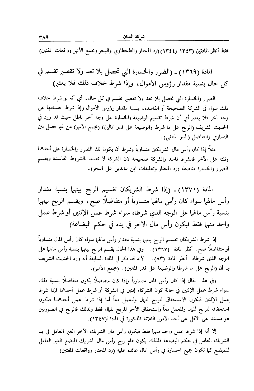 الْمَادَّةُ (1369) - (الضَّرَرُ وَالْخَسَارَةُ الَّتِي تَحْصُلُ بِلَا تَعَدٍّ وَلَا تَقْصِيرٍ تُقْسَمُ فِي كُلِّ حَالٍ بِنِسْبَةِ مِقْدَارِ رُءُوسِ الْأَمْوَالِ، وَإِذَا شُرِطَ خِلَافُ ذَلِكَ فَلَا يُعْتَبَرُ)