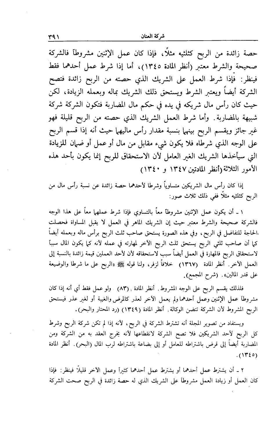 حِصَّةٌ زَائِدَةٌ مِنْ الرِّبْحِ كَثُلُثَيْهِ مَثَلًا، فَإِذَا كَانَ عَمَلُ الِاثْنَيْنِ مَشْرُوطًا فَالشَّرِكَةُ صَحِيحَةٌ وَالشَّرْطُ مُعْتَبَرٌ (اُنْظُرْ الْمَادَّةَ 1345) ، أَمَّا إذَا شُرِطَ عَمَلُ أَحَدِهِمَا فَقَطْ فَيُنْظَرُ: وَإِذَا شُرِطَ الْعَمَلُ عَلَى الشَّرِيكِ الَّذِي حِصَّتُهُ مِنْ الرِّبْحِ زَائِدَةٌ فَتَصِحُّ الشَّرِكَةُ أَيْضًا وَيُعْتَبَرُ الشَّرْطُ وَيَسْتَحِقُّ ذَلِكَ الشَّرِيكُ بِمَالِهِ وَبِعَمَلِهِ الزِّيَادَةَ، لَكِنْ حَيْثُ كَانَ رَأْسُ مَالِ شَرِيكِهِ فِي يَدِهِ فِي حُكْمِ مَالِ الْمُضَارَبَةِ فَتَكُونُ الشَّرِكَةُ شَرِكَةً شَبِيهَةً بِالْمُضَارَبَةِ. وَأَمَّا إذَا شُرِطَ الْعَمَلُ عَلَى الشَّرِيكِ الَّذِي حِصَّتُهُ مِنْ الرِّبْحِ قَلِيلَةٌ فَهُوَ غَيْرُ جَائِزٍ وَيُقْسَمُ الرِّبْحُ بَيْنَهُمَا بِنِسْبَةِ مِقْدَارِ رَأْسِ مَالَيْهِمَا حَيْثُ إنَّهُ إذَا قُسِمَ الرِّبْحُ عَلَى الْوَجْهِ الَّذِي شَرَطَاهُ فَلَا يَكُونُ شَيْءٌ مُقَابِلٌ مِنْ مَالٍ أَوْ عَمَلٍ أَوْ ضَمَانٍ لِلزِّيَادَةِ الَّتِي سَيَأْخُذُهَا الشَّرِيكُ الْغَيْرُ الْعَامِلِ لِأَنَّ الِاسْتِحْقَاقَ لِلرِّبْحِ إنَّمَا يَكُونُ بِأَحَدِ هَذِهِ الْأُمُورِ الثَّلَاثَةِ) (اُنْظُرْ الْمَادَّتَيْنِ 1347 وَ 1340)
