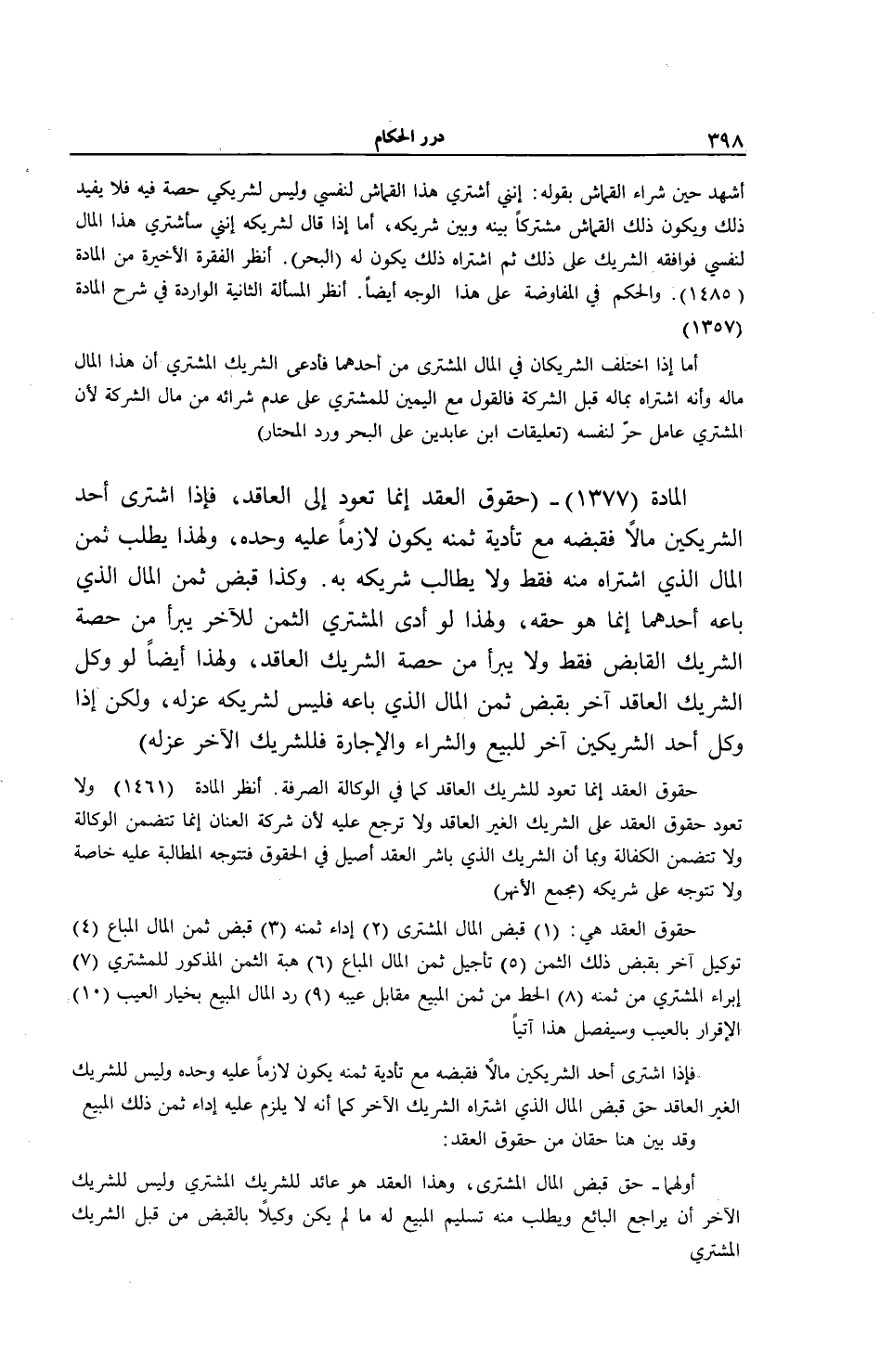 حُقُوقُ الْعَقْدِ هِيَ: (1) قَبْضُ الْمَالِ الْمُشْتَرَى (2) أَدَاءُ ثَمَنِهِ (3) قَبْضُ ثَمَنِ الْمَالِ الْمُبَاعِ (4) تَوْكِيلُ آخَرَ بِقَبْضِ ذَلِكَ الثَّمَنِ (5) تَأْجِيلُ ثَمَنِ الْمَالِ الْمُبَاعِ (6) هِبَةُ الثَّمَنِ الْمَذْكُورِ لِلْمُشْتَرِي (7) إبْرَاءُ الْمُشْتَرِي مِنْ ثَمَنِهِ (8) الْحَطُّ مِنْ ثَمَنِ الْمَبِيعِ مُقَابِلُ عَيْبِهِ (9) رَدُّ الْمَالِ الْمَبِيعِ بِخِيَارِ الْعَيْبِ (10) الْإِقْرَارُ بِالْعَيْبِ وَسَيُفَصَّلُ هَذَا آتِيًا، فَإِذَا اشْتَرَى أَحَدُ الشَّرِيكَيْنِ مَالًا فَقَبَضَهُ مَعَ تَأْدِيَةِ ثَمَنِهِ يَكُونُ لَازِمًا عَلَيْهِ وَحْدَهُ وَلَيْسَ لِلشَّرِيكِ الْغَيْرِ الْعَاقِدِ حَقُّ قَبْضِ الْمَالِ الَّذِي اشْتَرَاهُ الشَّرِيكُ الْآخَرُ كَمَا أَنَّهُ لَا يَلْزَمُ عَلَيْهِ أَدَاءُ ثَمَنِ ذَلِكَ الْمَبِيعِ وَقَدْ بُيِّنَ هُنَا حَقَّانِ مِنْ حُقُوقِ الْعَقْدِ: