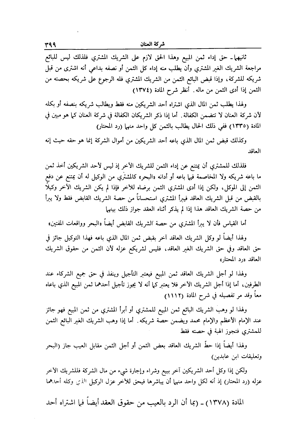 ثَانِيهِمَا - حَقُّ أَدَاءِ ثَمَنِ الْمَبِيعِ وَهَذَا الْحَقُّ لَازِمٌ عَلَى الشَّرِيكِ الْمُشْتَرِي فَلِذَلِكَ لَيْسَ لِلْبَائِعِ مُرَاجَعَةُ الشَّرِيكِ الْغَيْرِ الْمُشْتَرِي وَأَنْ يَطْلُبَ مِنْهُ أَدَاءَ كُلِّ الثَّمَنِ أَوْ نِصْفِهِ بِدَاعِي أَنَّهُ اُشْتُرِيَ مِنْ قِبَلِ شَرِيكِهِ لِلشَّرِكَةِ، وَإِذَا قَبَضَ الْبَائِعُ الثَّمَنَ مِنْ الشَّرِيكِ الْمُشْتَرِي فَلَهُ الرُّجُوعُ عَلَى شَرِيكِهِ بِحِصَّتِهِ مِنْ الثَّمَنِ إذَا أَدَّى الثَّمَنَ مِنْ مَالِهِ. اُنْظُرْ شَرْحَ الْمَادَّةِ (1374) وَلِهَذَا يُطْلَبُ ثَمَنُ الْمَالِ الَّذِي اشْتَرَاهُ أَحَدُ الشَّرِيكَيْنِ مِنْهُ فَقَطْ وَيُطَالَبُ شَرِيكُهُ بِنِصْفِهِ أَوْ بِكُلِّهِ لِأَنَّ شَرِكَةَ الْعِنَانِ لَا تَتَضَمَّنُ الْكَفَالَةَ أَمَّا إذَا ذَكَرَ الشَّرِيكَانِ الْكَفَالَةَ فِي شَرِكَةِ الْعِنَانِ كَمَا هُوَ مُبَيَّنٌ فِي الْمَادَّةِ (1335) فَفِي ذَلِكَ الْحَالِ يُطَالَبُ بِالثَّمَنِ كُلُّ وَاحِدٍ مِنْهُمَا (رَدُّ الْمُحْتَارِ) .